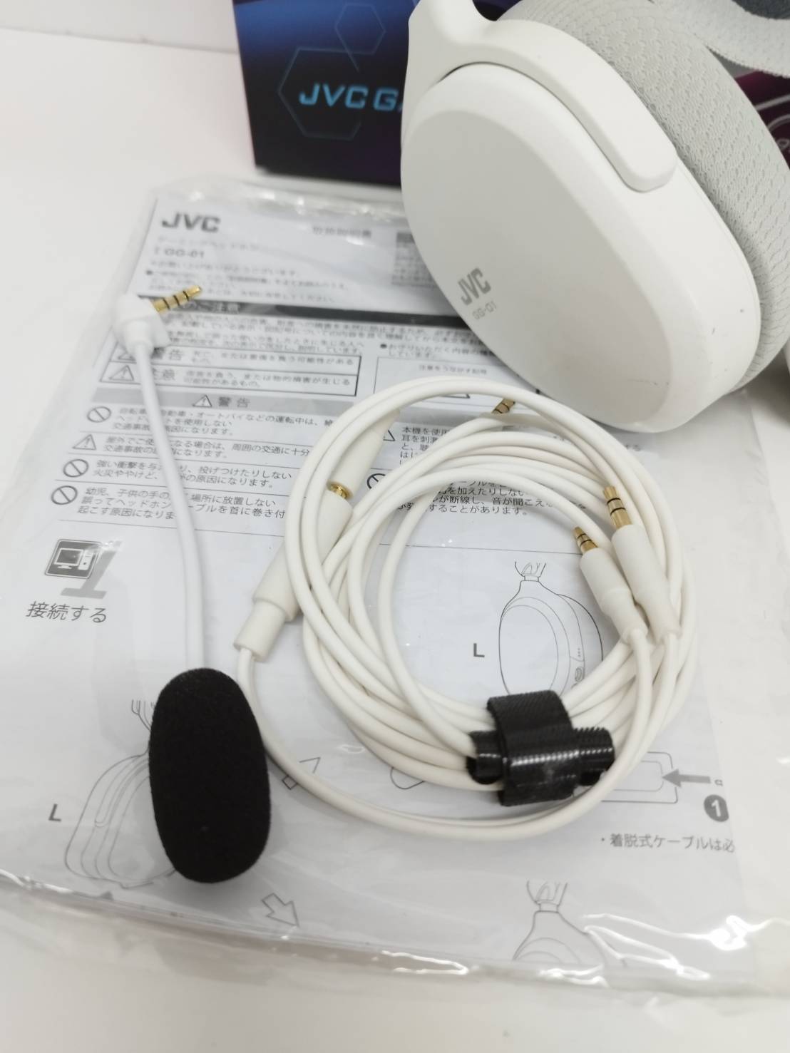 ヘッドホン、取り外し可能なマイク、オーディオケーブル、印刷物(画像1枚目に写っているもの)