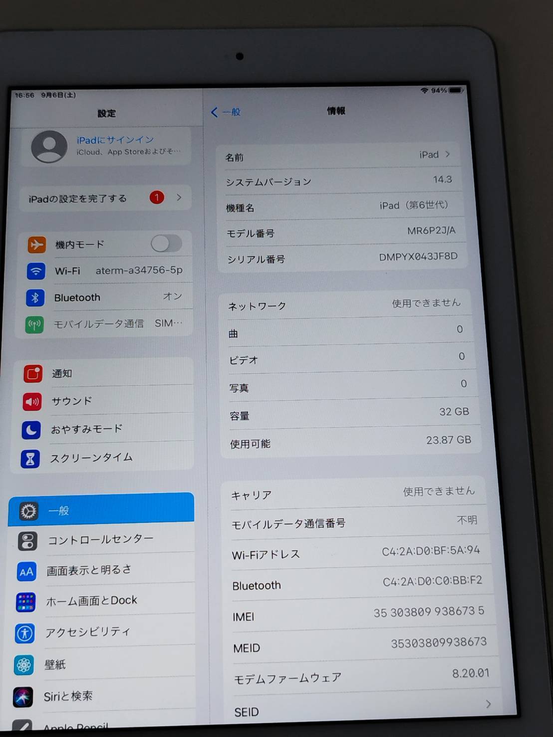 【良品/SIMフリー】iPad 第6世代/A1954/32GB〈MR6P2J/A〉