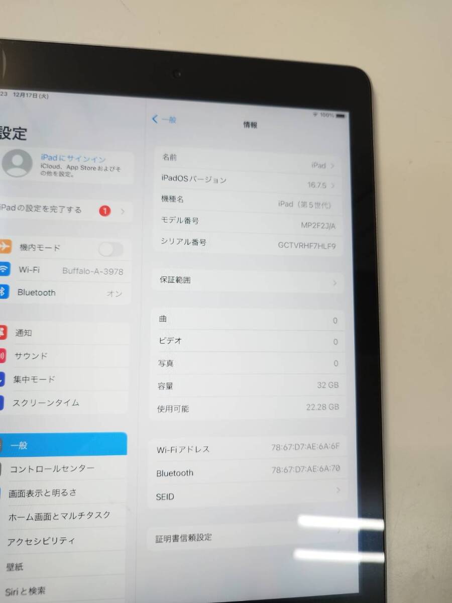 【Wi-Fiモデル】iPad 第5世代/32GB/A1822〈MP2F2J/A〉
