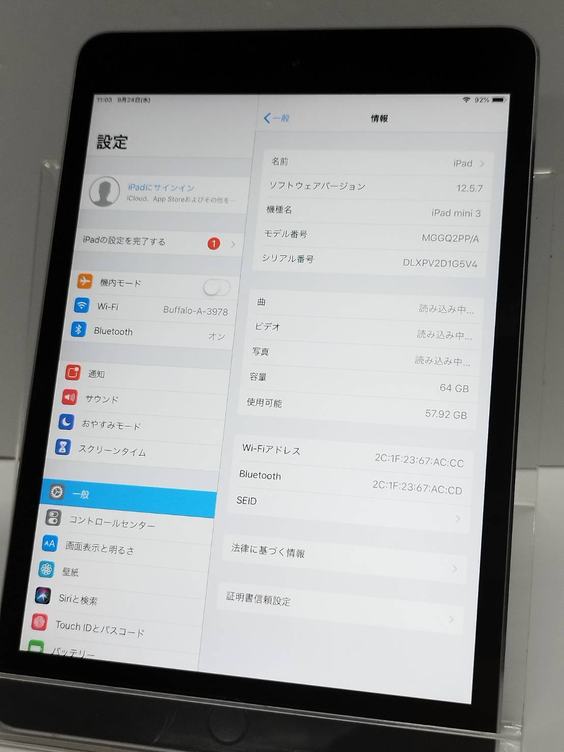 【Wi-Fiモデル】iPad mini 3/A1599/64GB〈MGGQ2PP/A〉