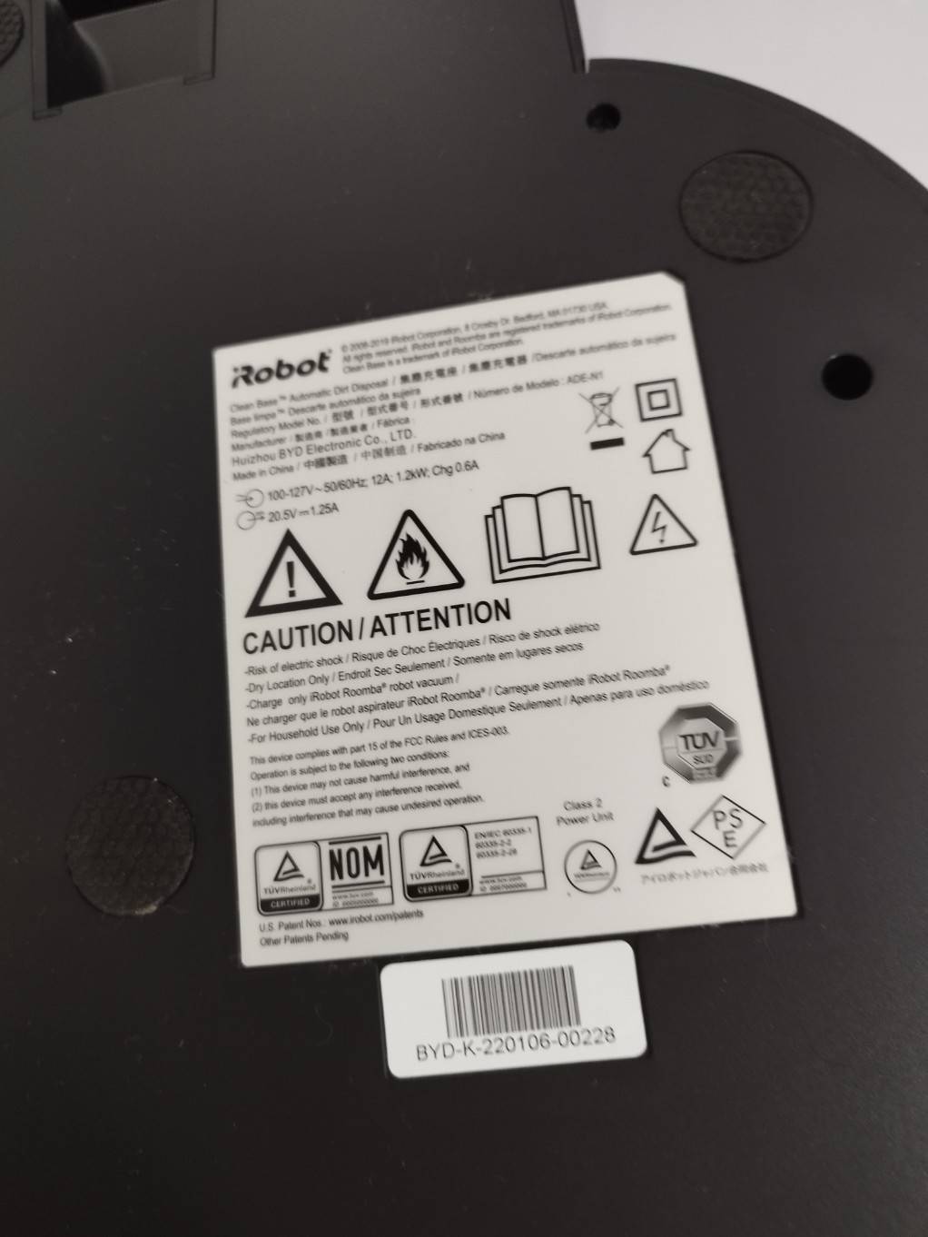 内容物:ルンバ、充電ベース、電源ケーブル、説明書(画像1枚目に写っているもの)