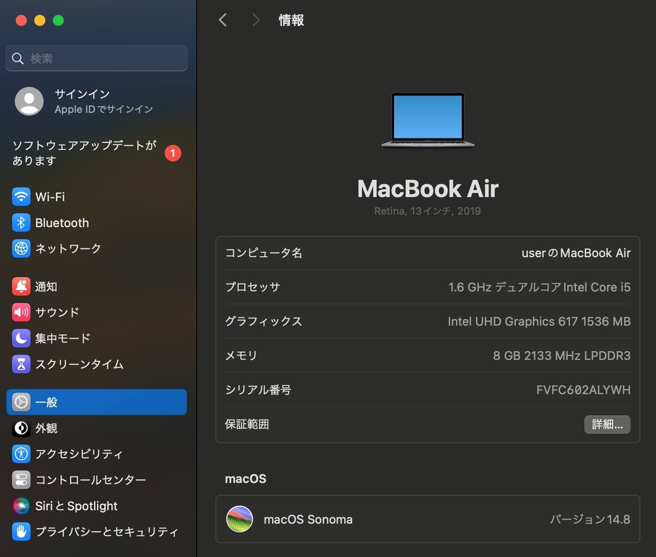 MacBook Air(Retina, 13インチ,2019)256GB/8GB〈MVFJ2J/A〉⑤