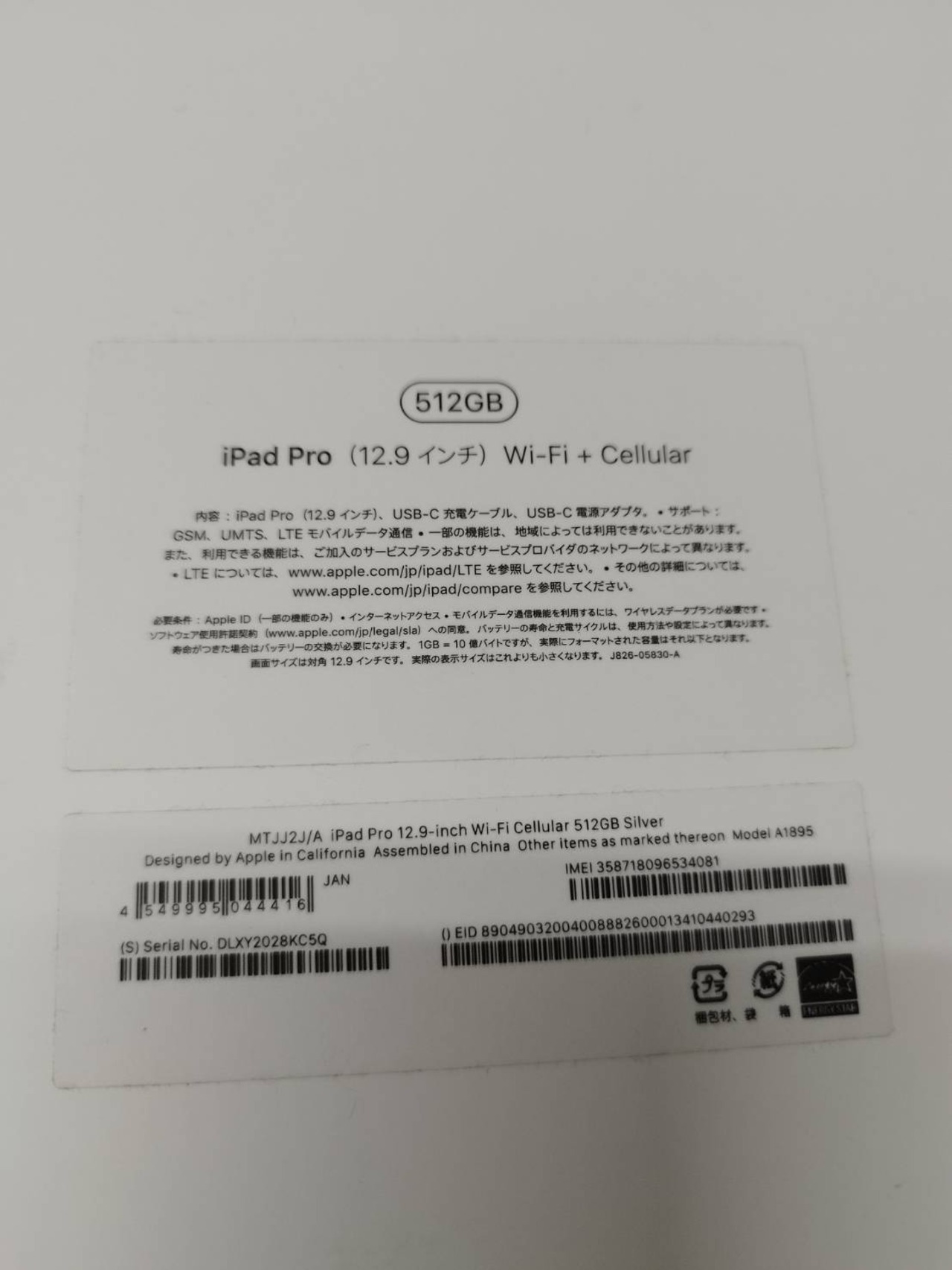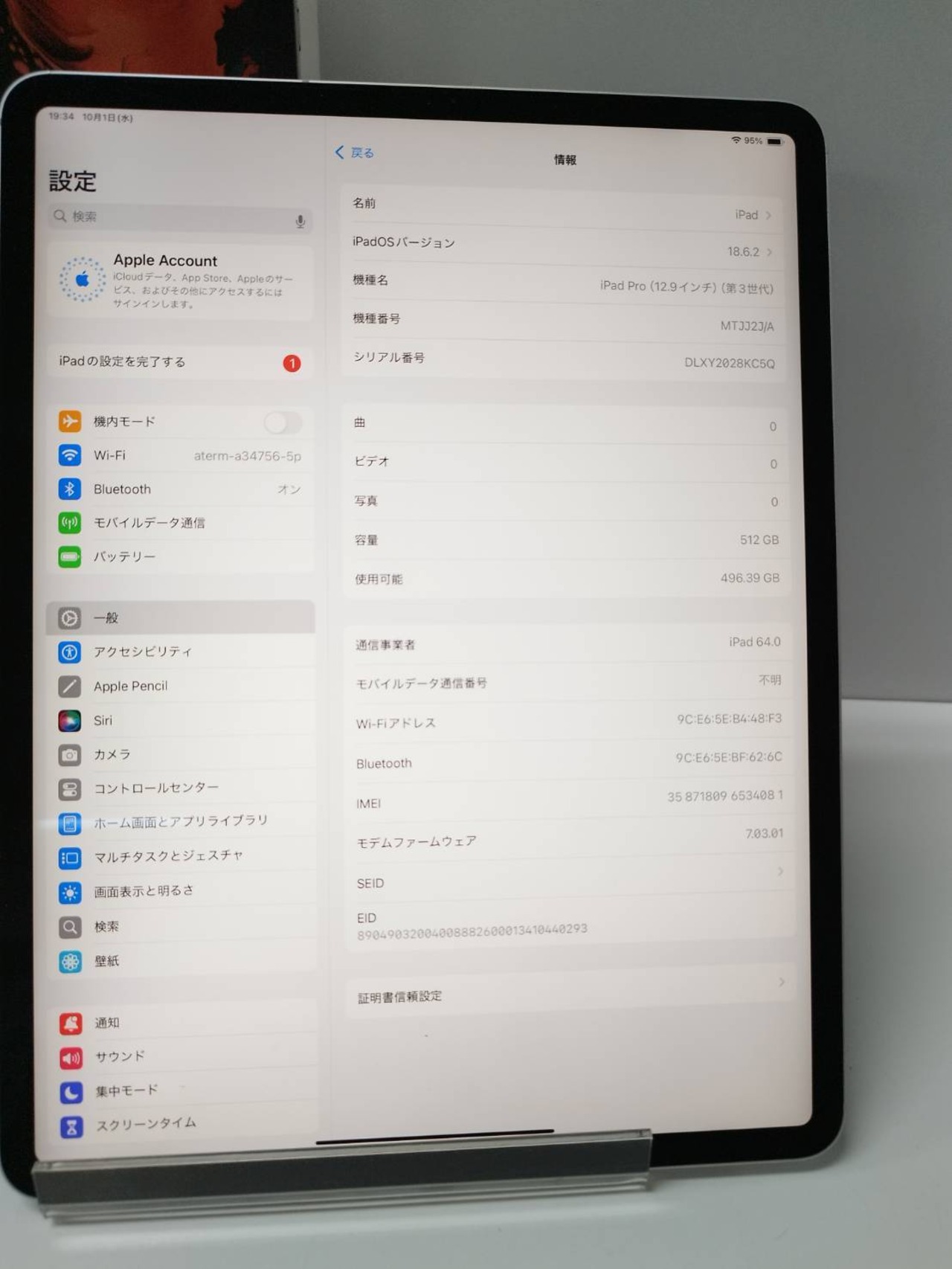 【Wi-Fi+Cellular】iPad Pro 12.9インチ(第3世代)/A1895/512GB〈MTJJ2J/A〉アップルペンシル(A2051)つき!