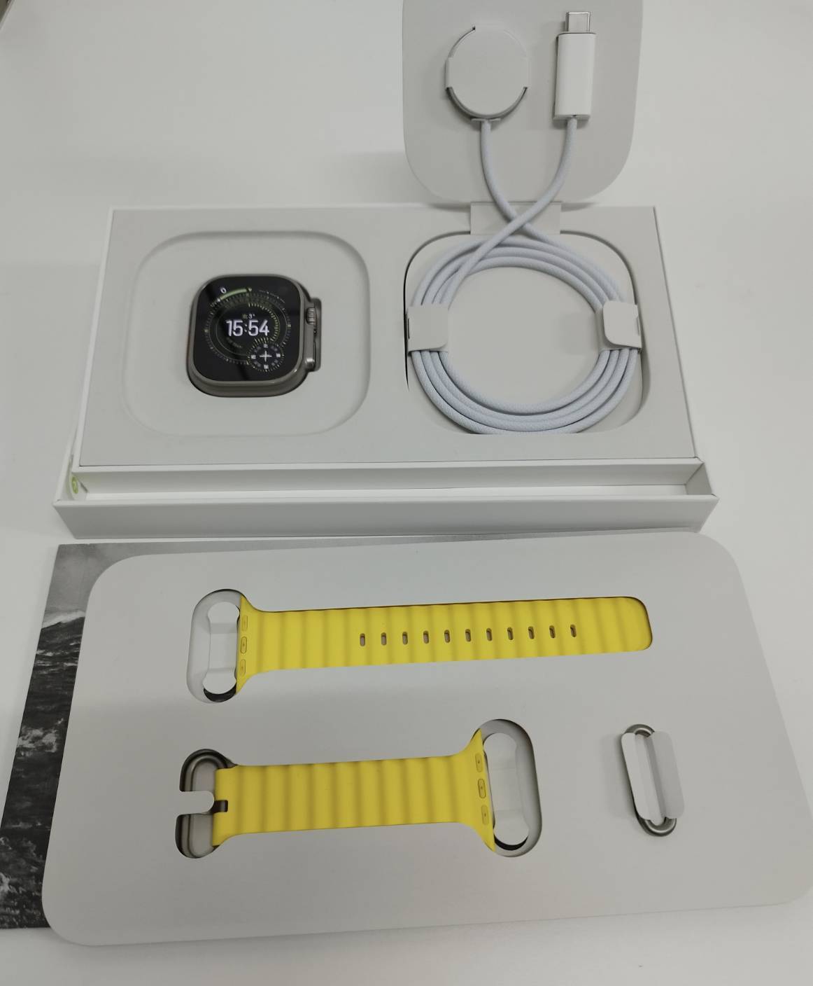 本体、オーシャンバンド(イエロー)、充電ケーブル、印刷物、箱(画像1枚目に写っているもの)