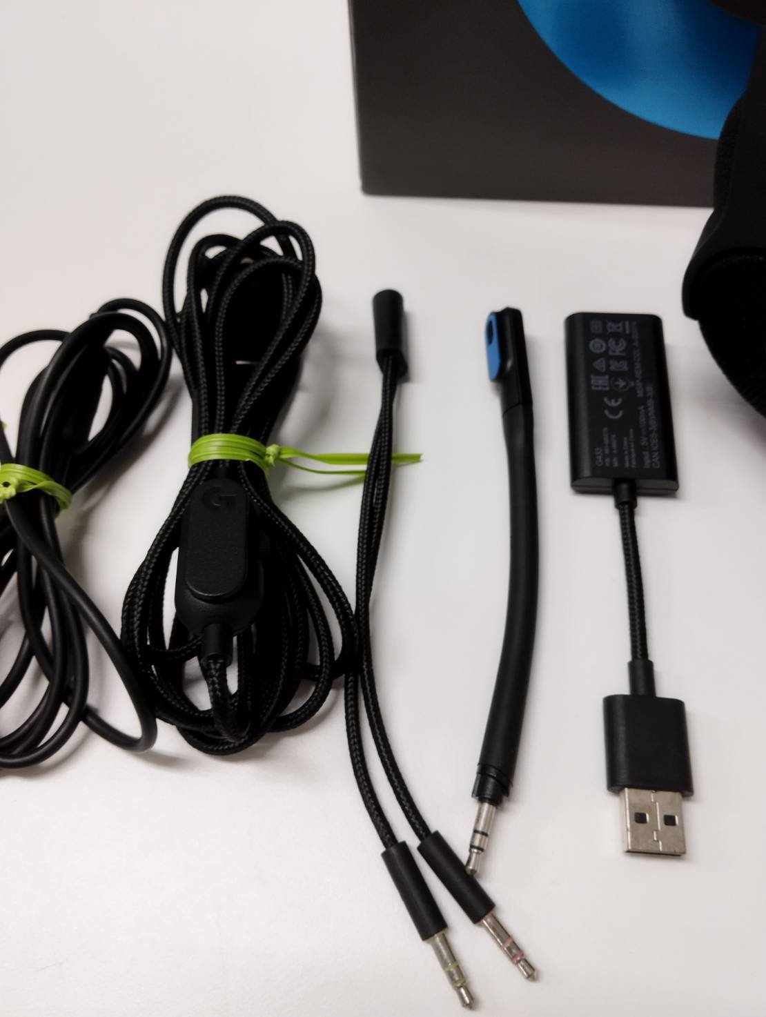 内容物:本体、ケーブル、着脱式マイク、USBサウンドカード、Yスプリッタ(画像1枚目に写っているもの)