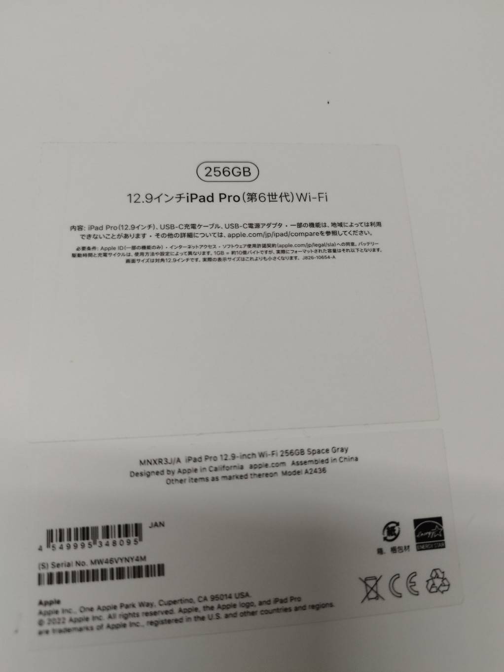 内容物:本体、アダプタ、ケーブル、印刷物、アップルペンシル(画像1枚目