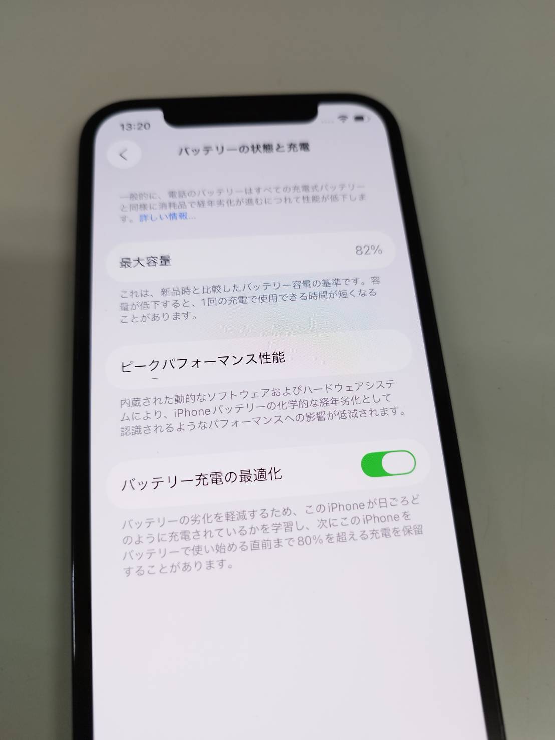 本体に目立つ傷や汚れなし、液晶の状態も良好です。バッテリー最大容量82%