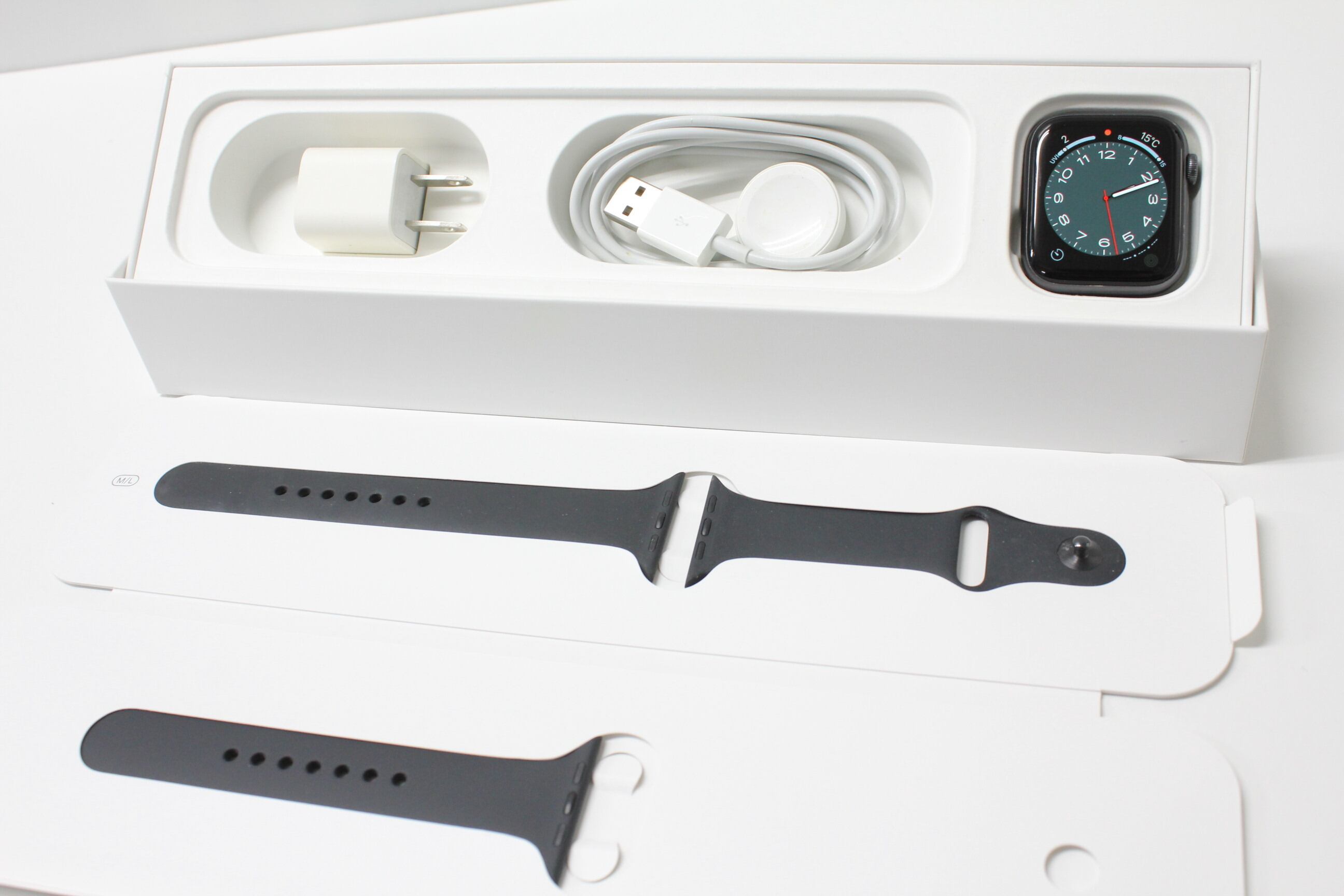 本体、スポーツバンド、充電ケーブル、元箱(画像1枚目に写っているものすべて)