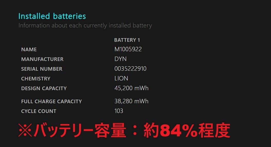 バッテリー状態:画像をご参考ください(※バッテリーは消耗品のため、保証致しかねます。またバッテリー状態はあくまで参考値のため、実際の稼働時間を保証するものではございません。)
