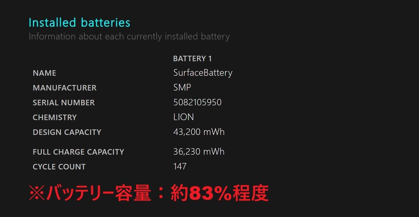 バッテリー状態:画像をご参考ください(※バッテリーは消耗品のため、保証致しかねます。またバッテリー状態はあくまで参考値のため、実際の稼働時間を保証するものではございません。)