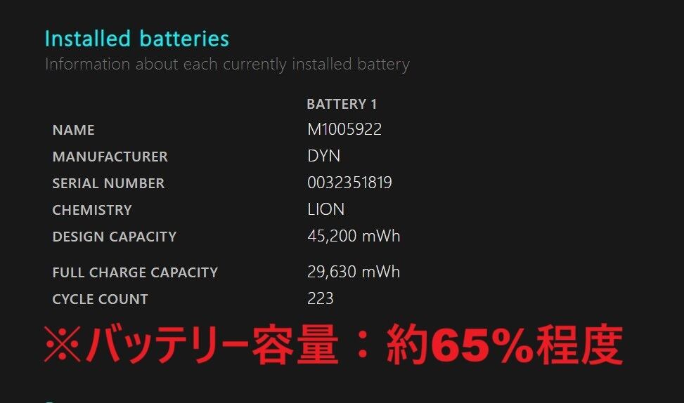 バッテリー状態:画像をご参考ください(※バッテリーは消耗品のため、保証致しかねます。またバッテリー状態はあくまで参考値のため、実際の稼働時間を保証するものではございません。)