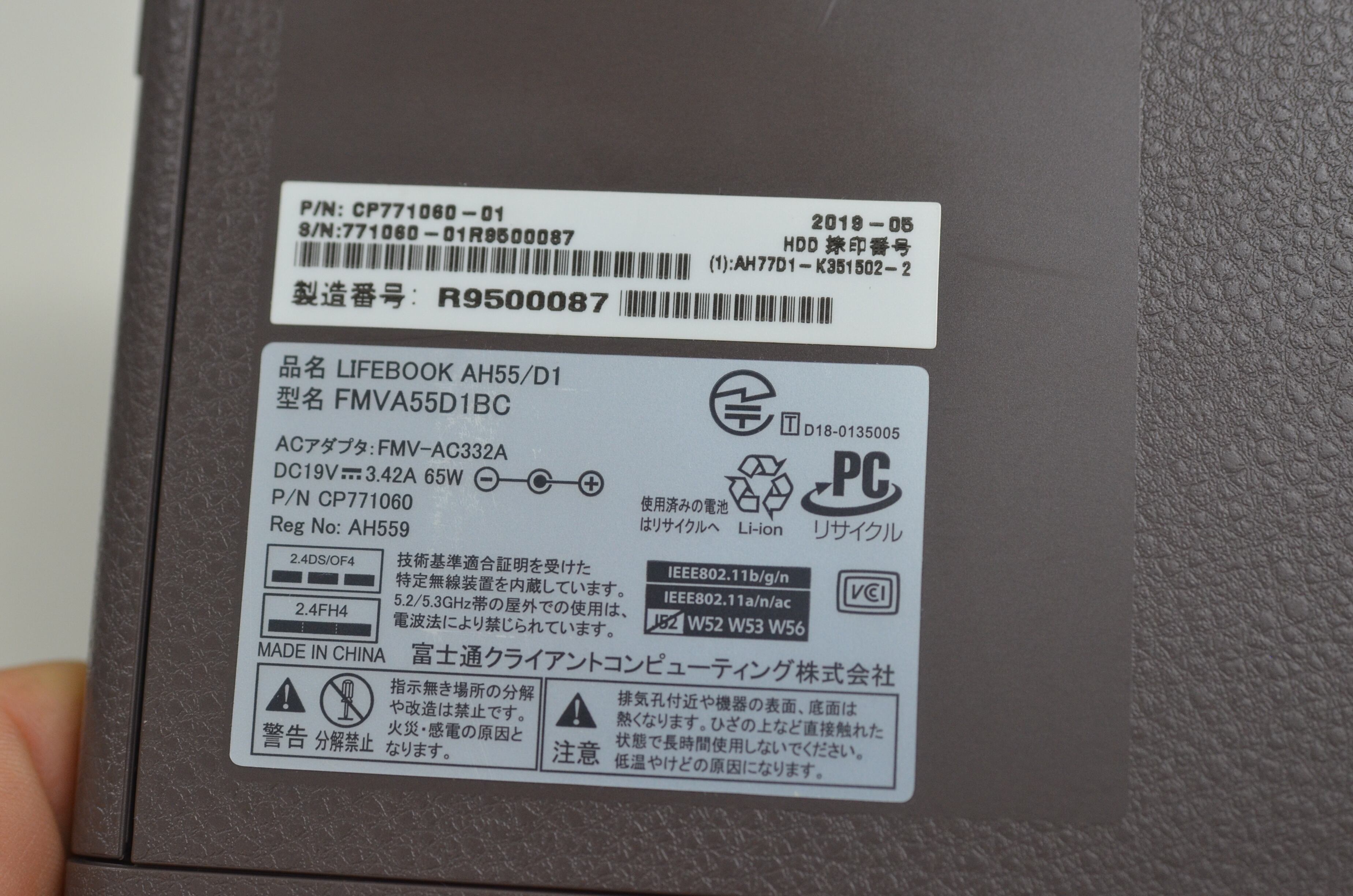 中古良品ノートパソコン 富士通AH55/D1 爆速SSD256GB、メモリー8GB、ブルーレイ、WEBカメラ搭載
