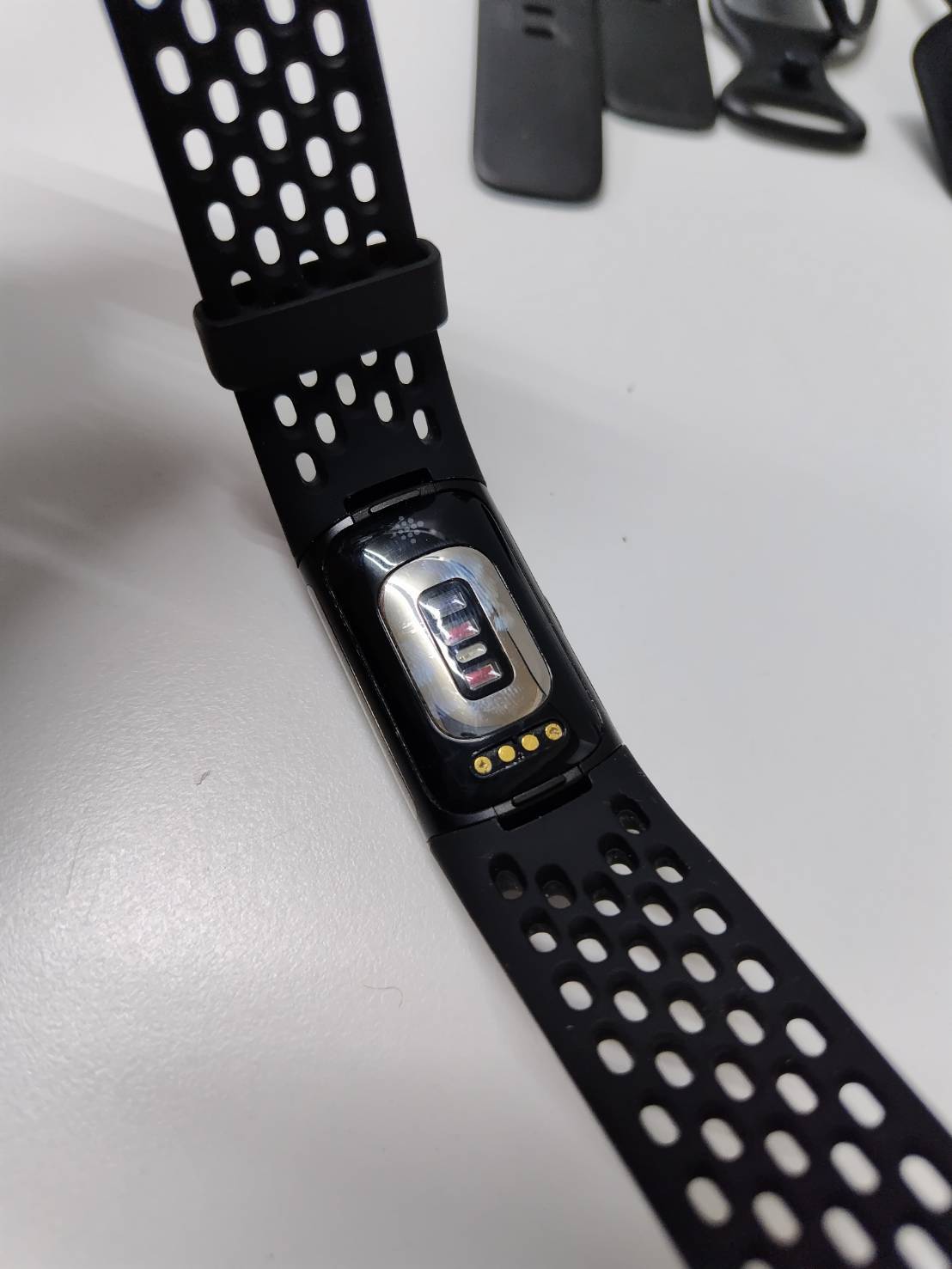 内容物:本体、バンド、充電ケーブル、印刷物(画像1枚目に写っているもの)