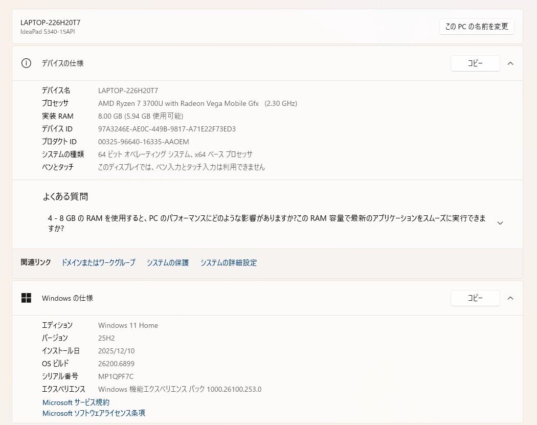 ・CPU:AMD Ryzen 7 3700U (2.30GHz)