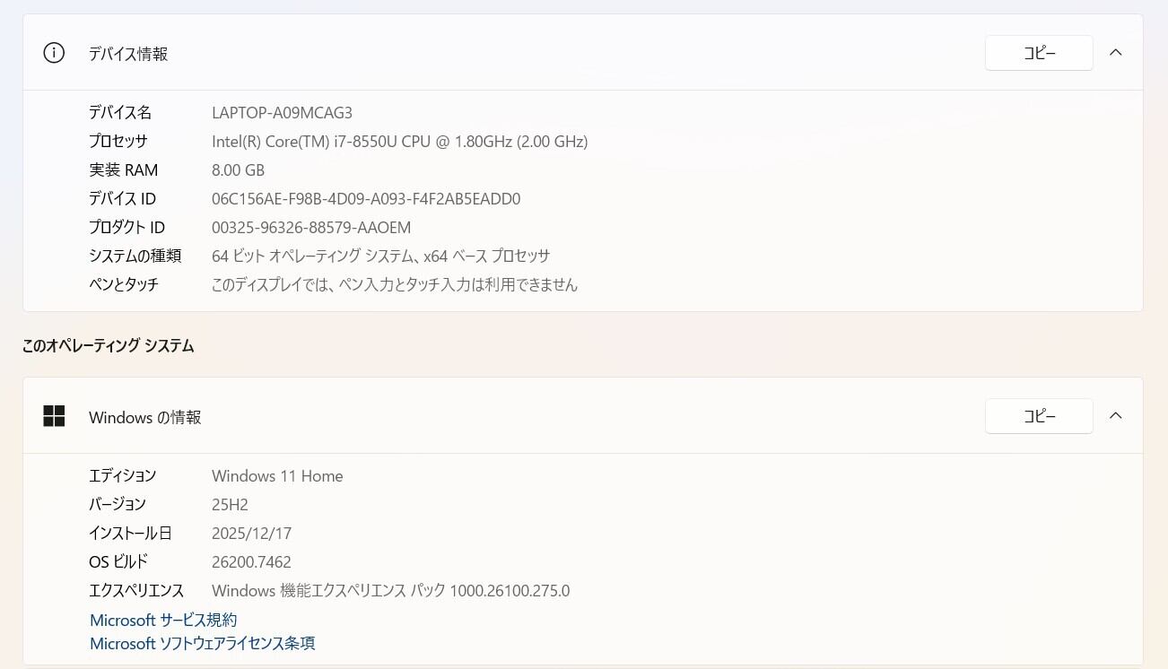 ・OS:Windows11 Home/25H2(ライセンス認証・Windows update済)