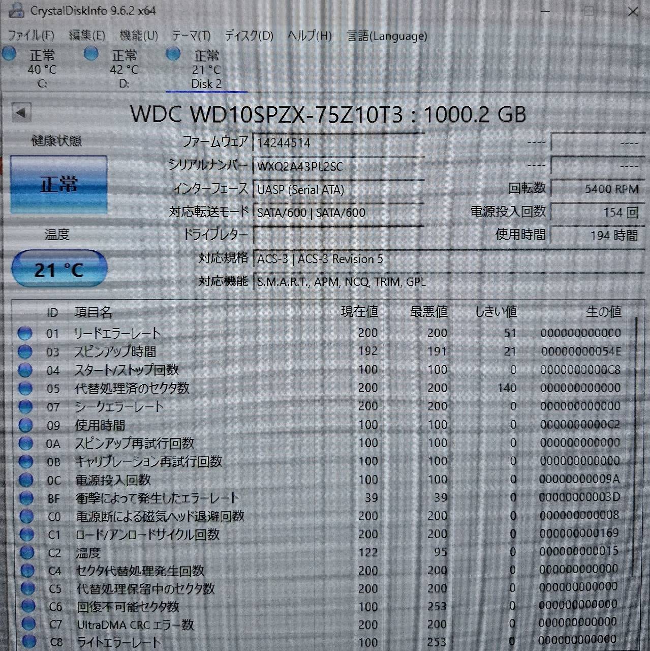 【中古パーツ】Western Digital製 HDD 1TB 2枚セット!WD10SPZX/WD10SPZX-08