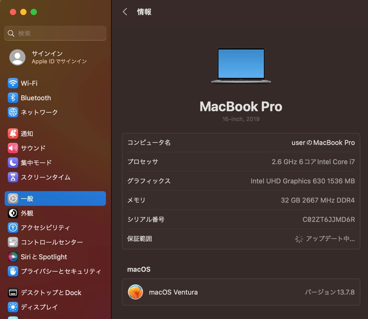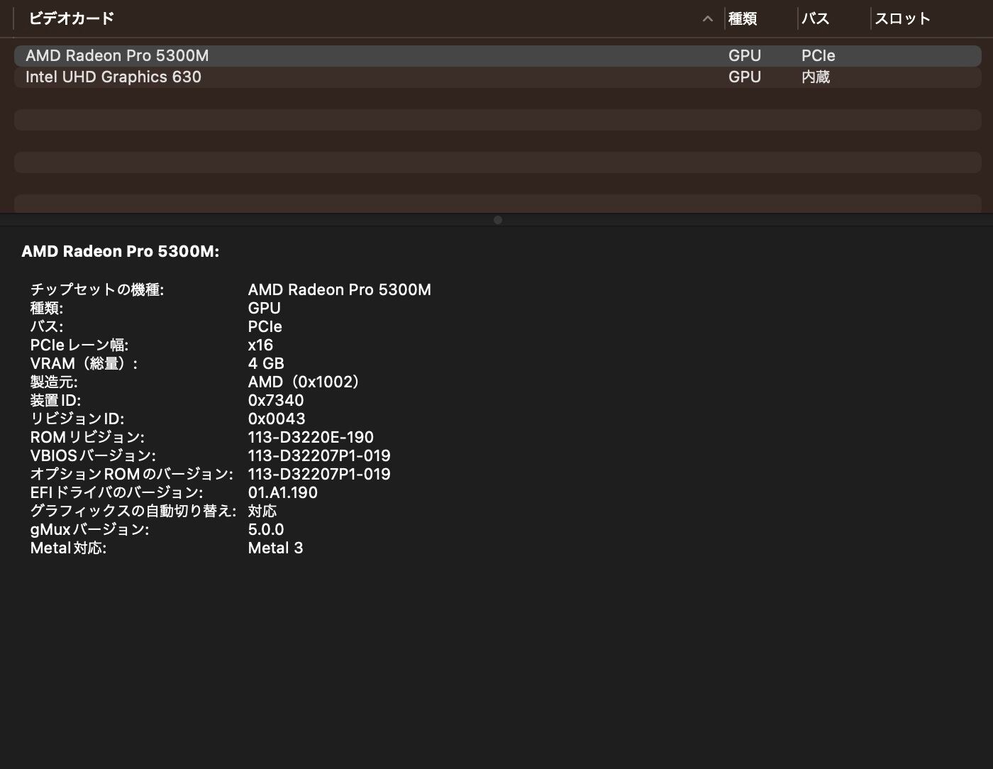 ・グラフィックス:Intel UHD Graphics 630 / AMD Radeon Pro 5300M