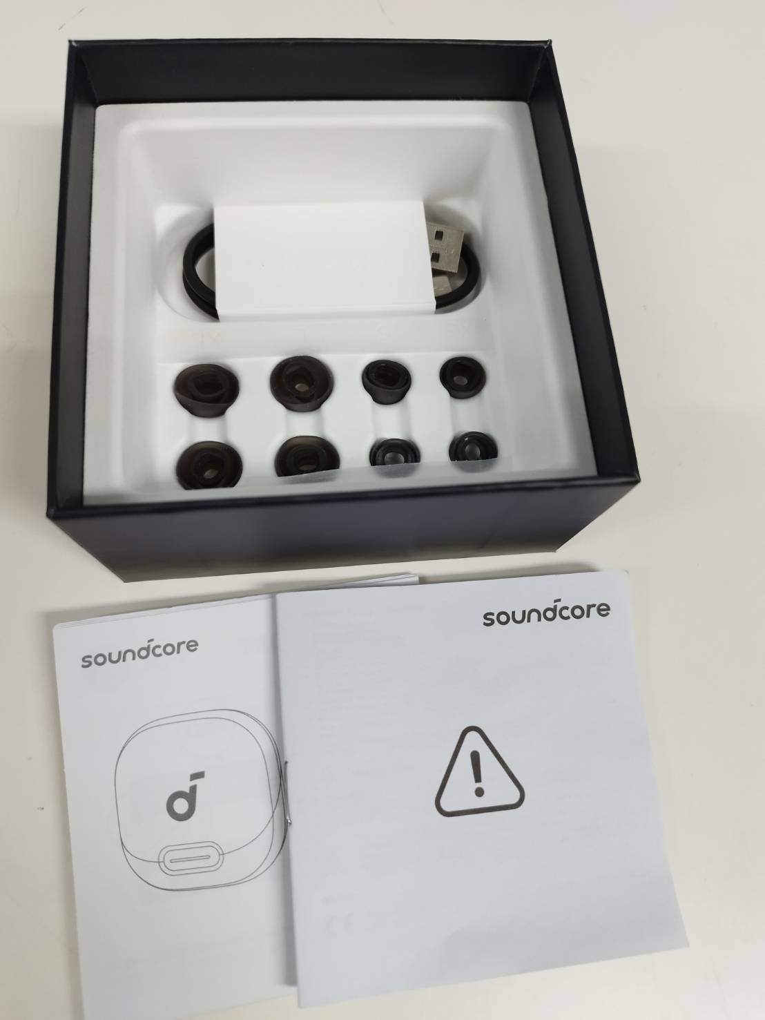 イヤホン、充電ケース、イヤーピース、Type-Cケーブル、クイックスタートガイド(画像1枚目に写っているもの)