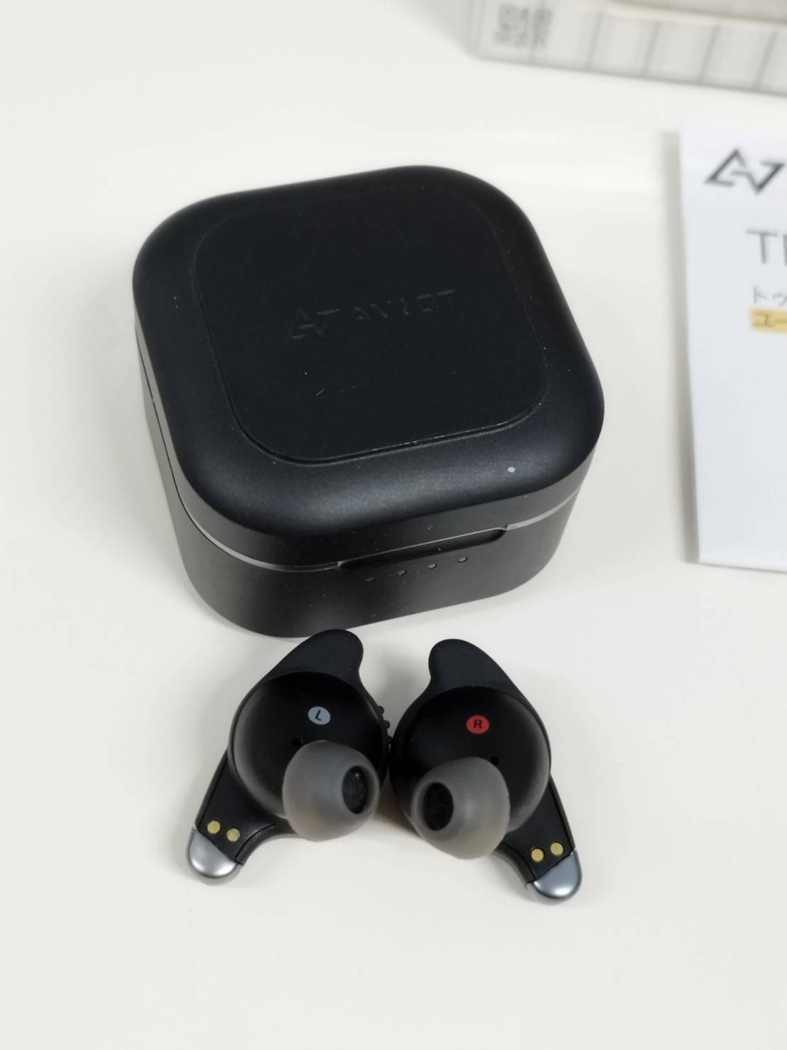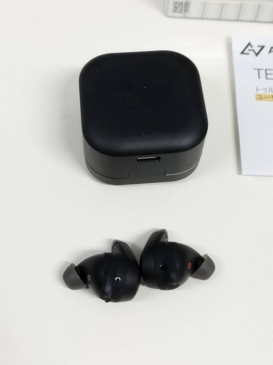 イヤホン、充電ケース、イヤーピース、Type-Cケーブル、ユーザーマニュアル(画像1枚目に写っているもの)