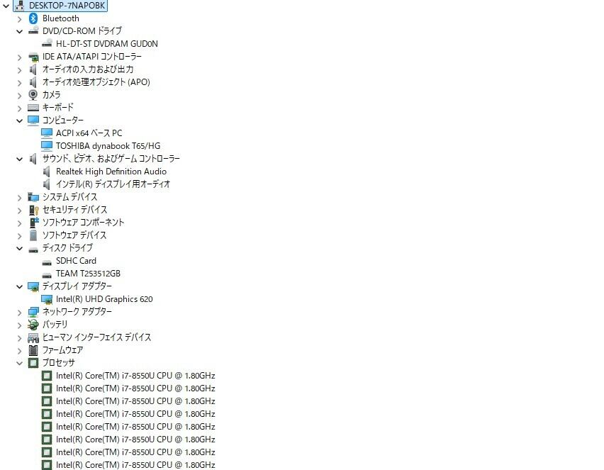 ・CPU:Intel core i7-8550U 1.80Ghz(1.99GHz)