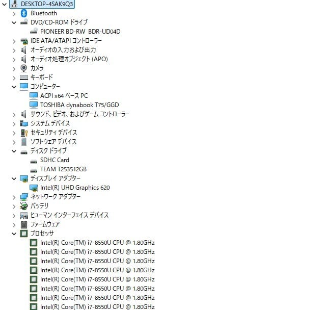 ・CPU:Intel core i7-8550U 1.80Ghz(1.99GHz)