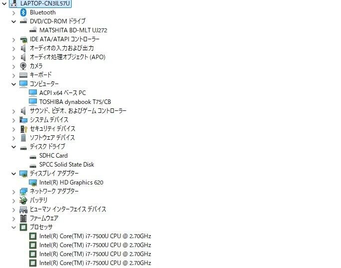 ・CPU:Intel core i7-7500U 2.70Ghz(2.90GHz)