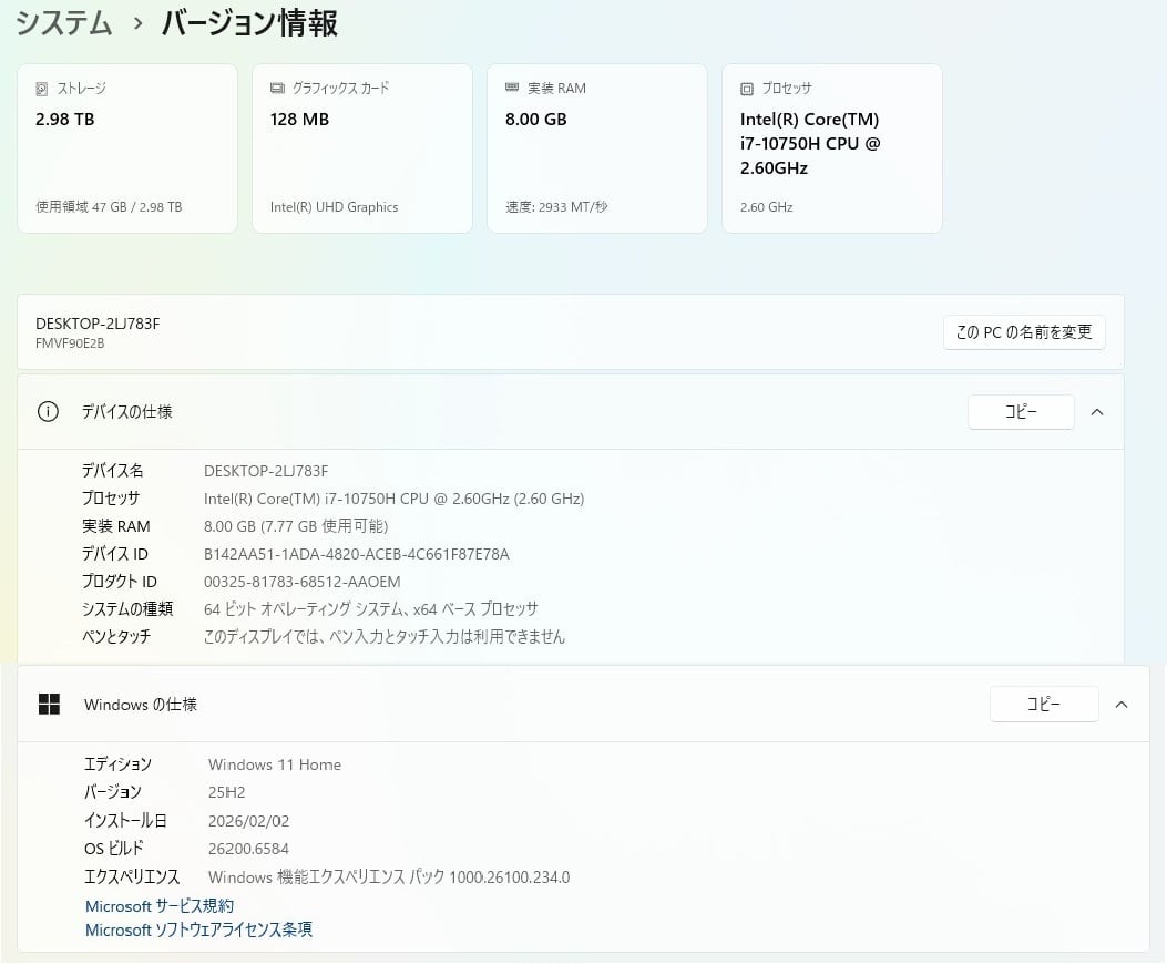 ・OS:Windows11 Home/25H2(ライセンス認証・Windows update済)
