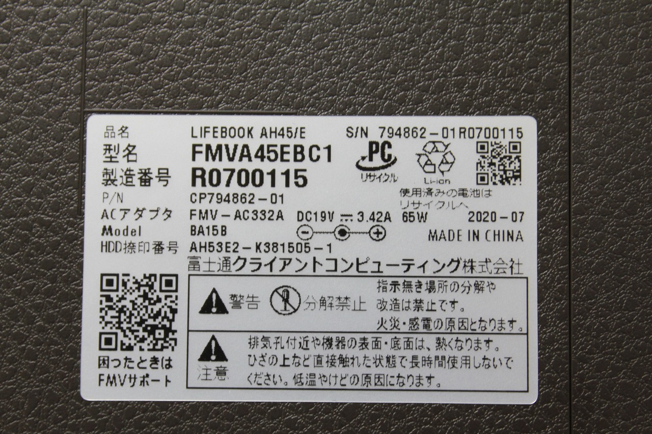 【中古ノートPC】富士通〈LIFEBOOK AH45/E〉Intel Core i3/SSD512GB/メモリ8GB ⑤