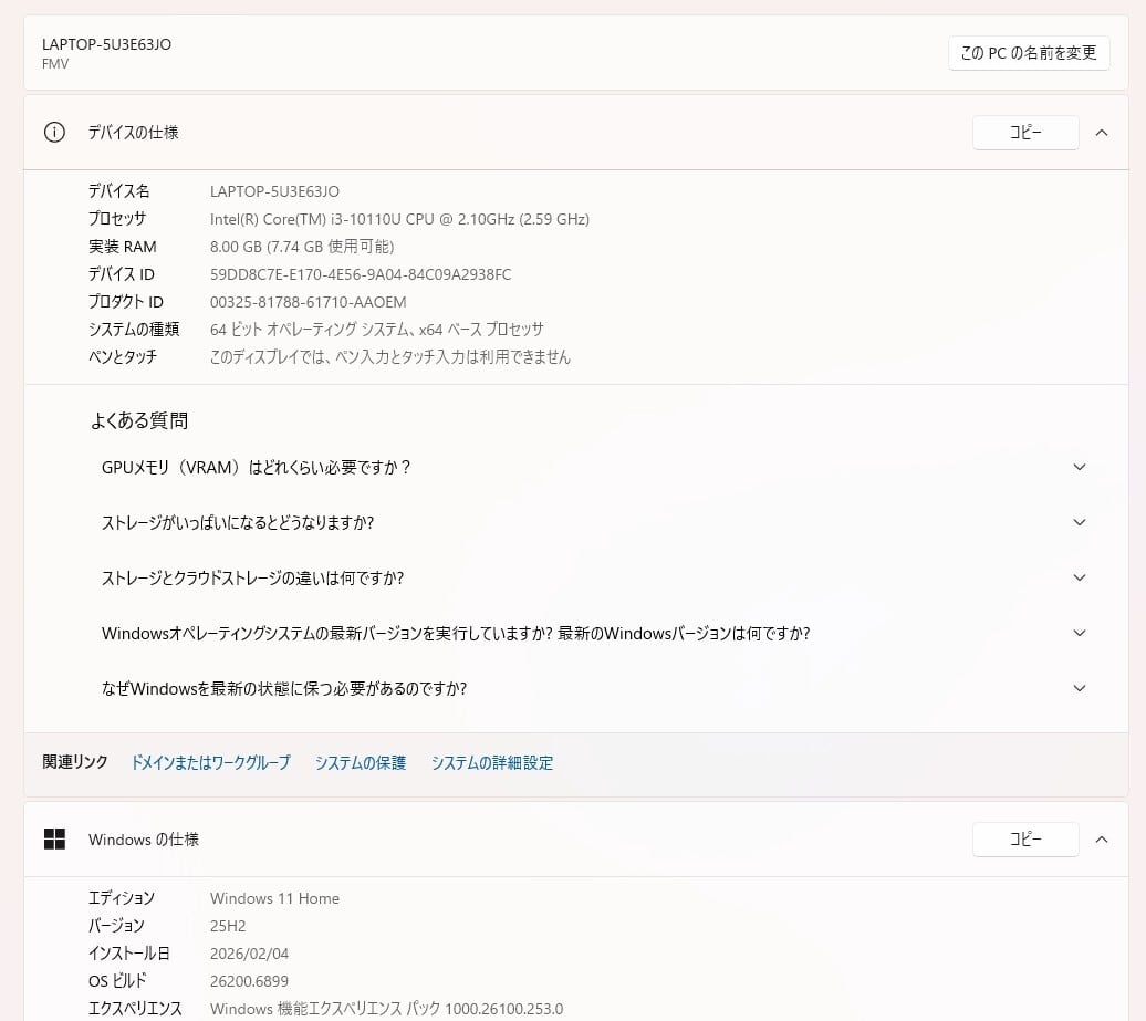 ・CPU:Intel Core i3-10110U 2.10GHz(2.59GHz)