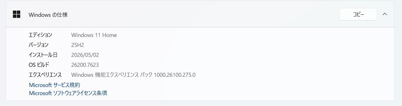 ・OS:Windows11 Home/25H2(ライセンス認証・Windows update済)