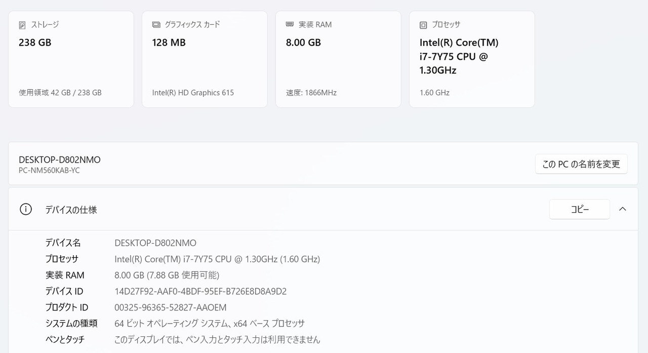 ・CPU:Intel Core i7-7Y75 1.30GHz(1.60GHz)