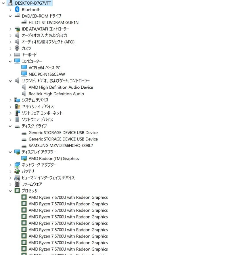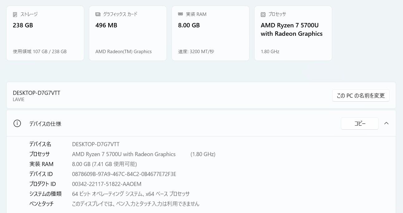 ・CPU:AMD Ryzen 7 5700U (1.80GHz)