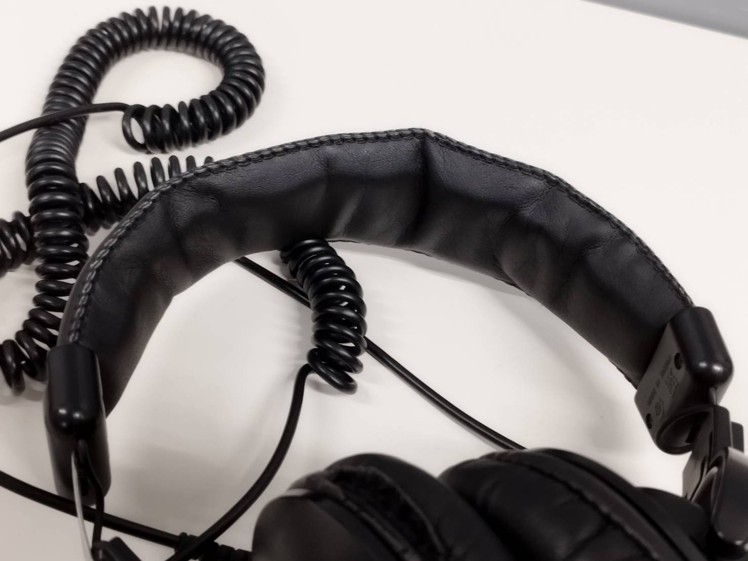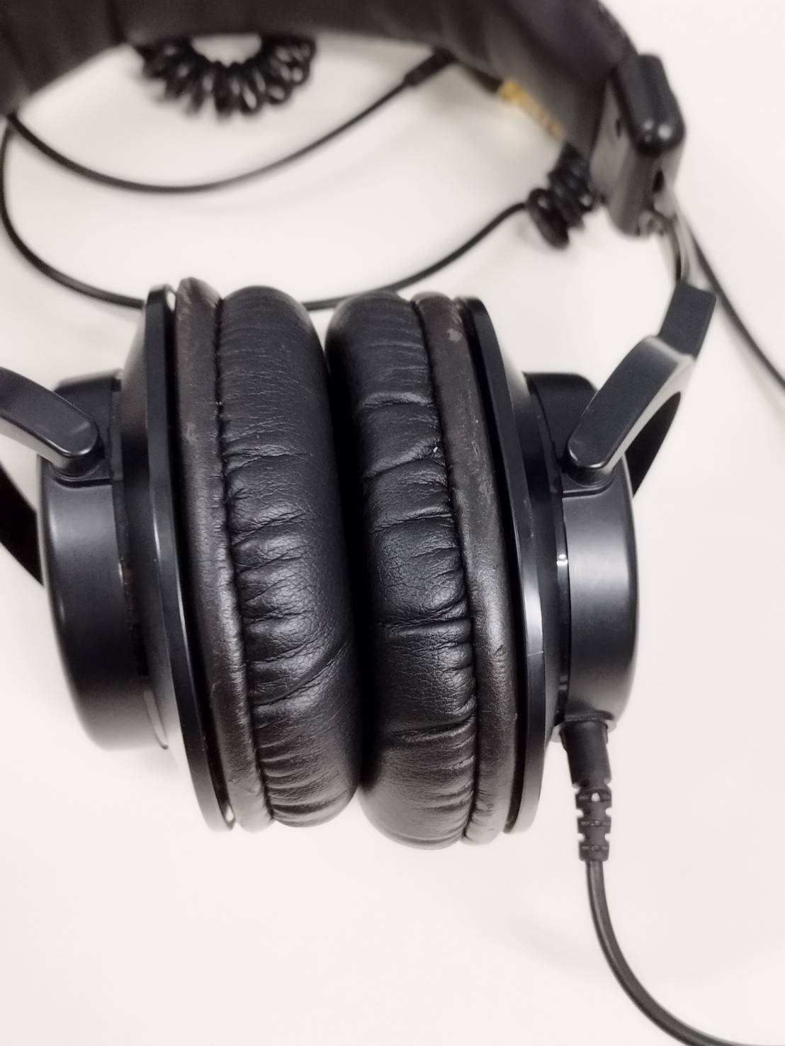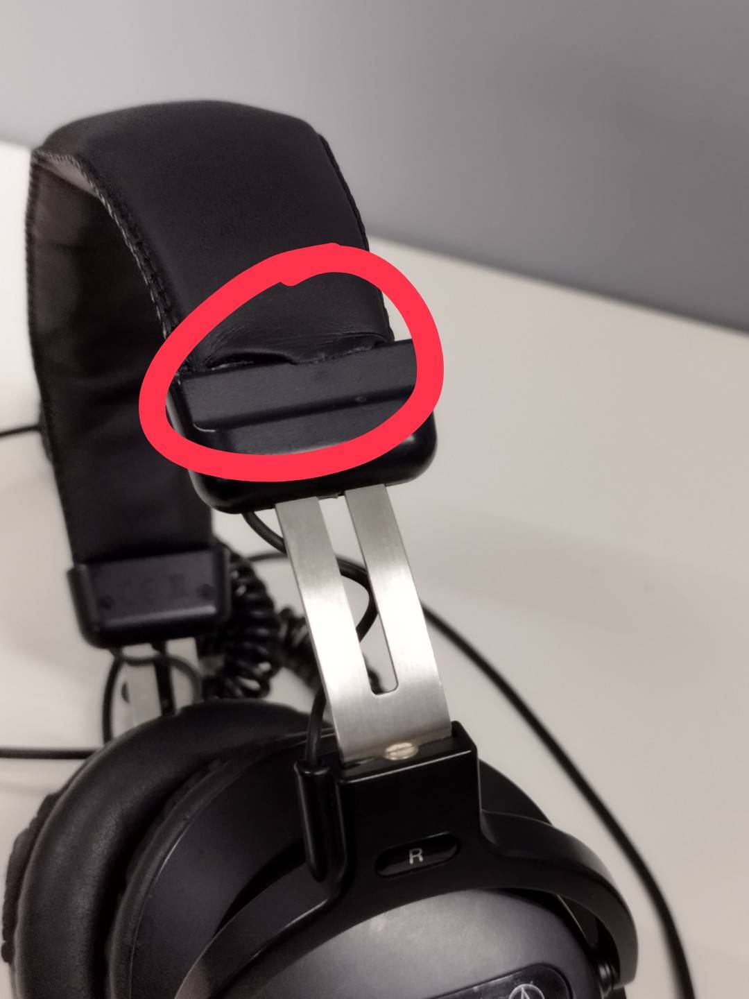 左耳イヤーパッド端の一部に破け(2枚目画像)、右耳側ヘッドバンドの表面生地が少し外側に出ています。(8枚目画像)