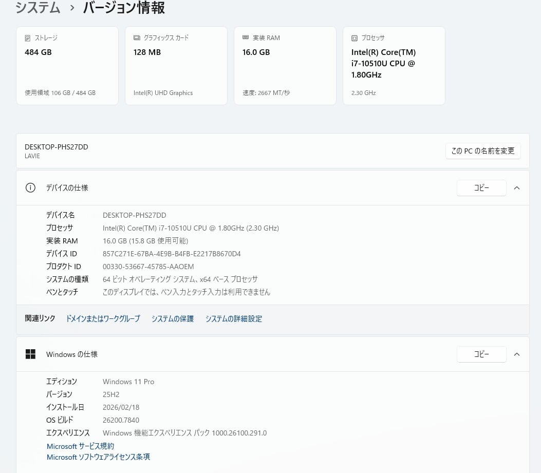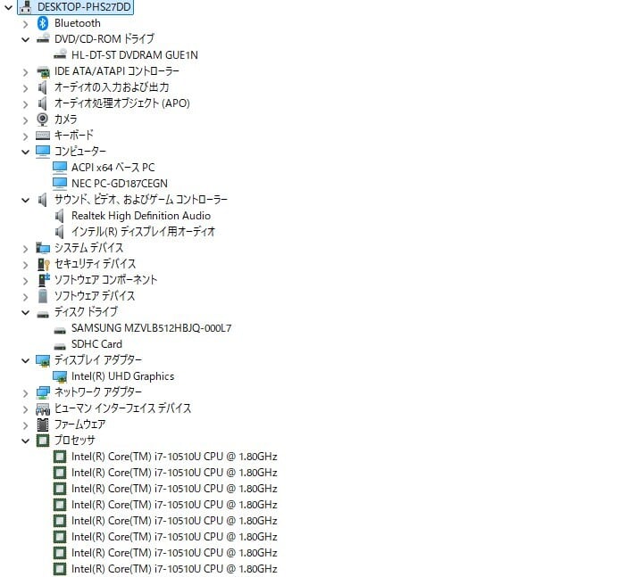 ・CPU:Intel Core i7-10510U 1.80GHz(2.30GHz)