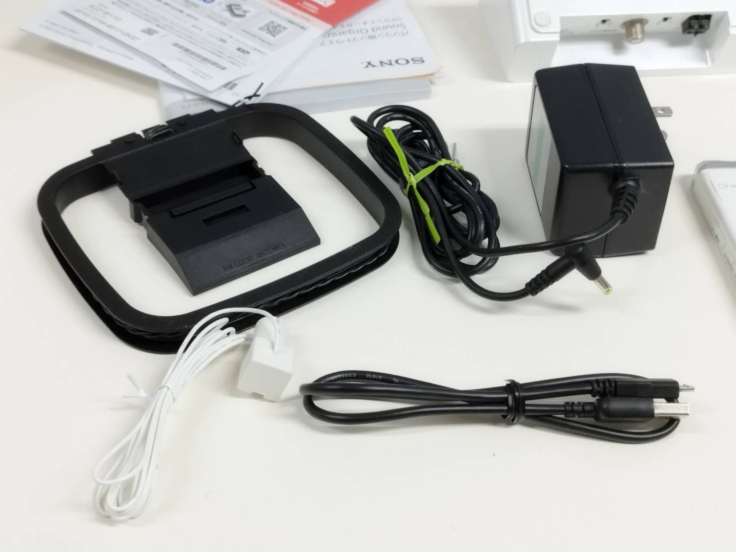本体、スピーカークレードル、ACアダプター、AMラジオ用ループアンテナ、
