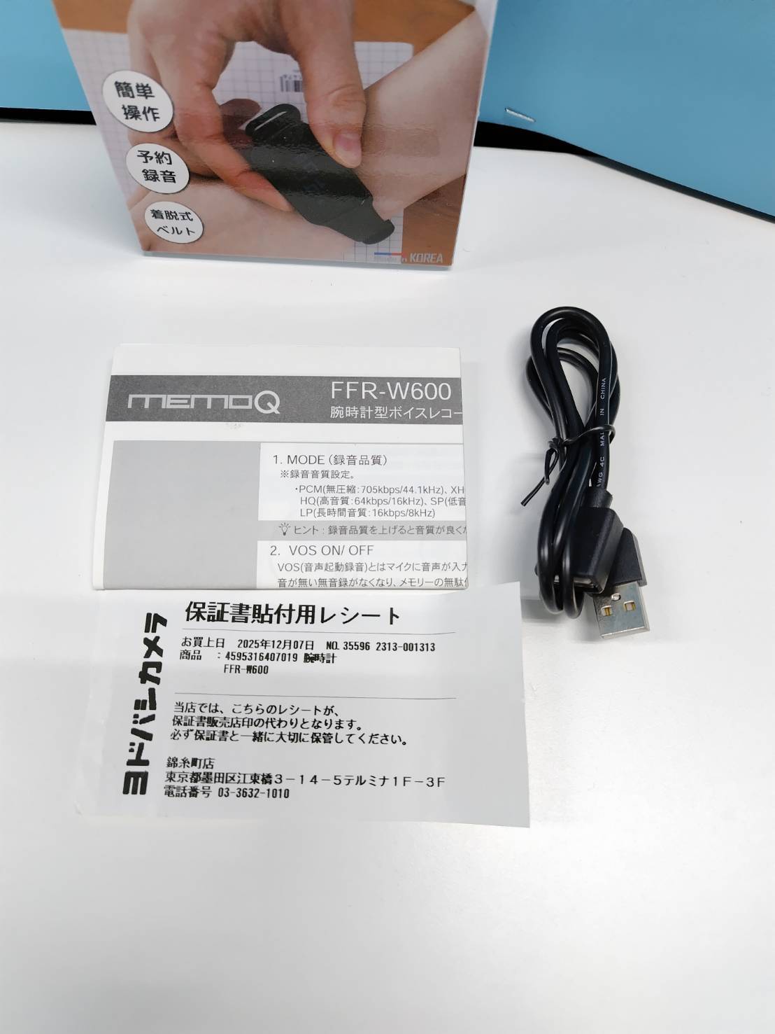 内容物:本体、バンド、充電ケーブル、説明書(画像1枚目に写っているもの)