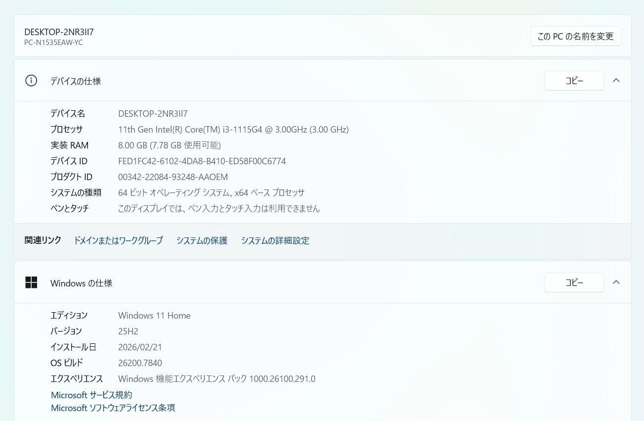 ・OS:Windows11 Home/25H2(ライセンス認証・Windows update済)