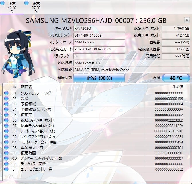 ・ストレージ:SSD 256GB + HDD 1TB