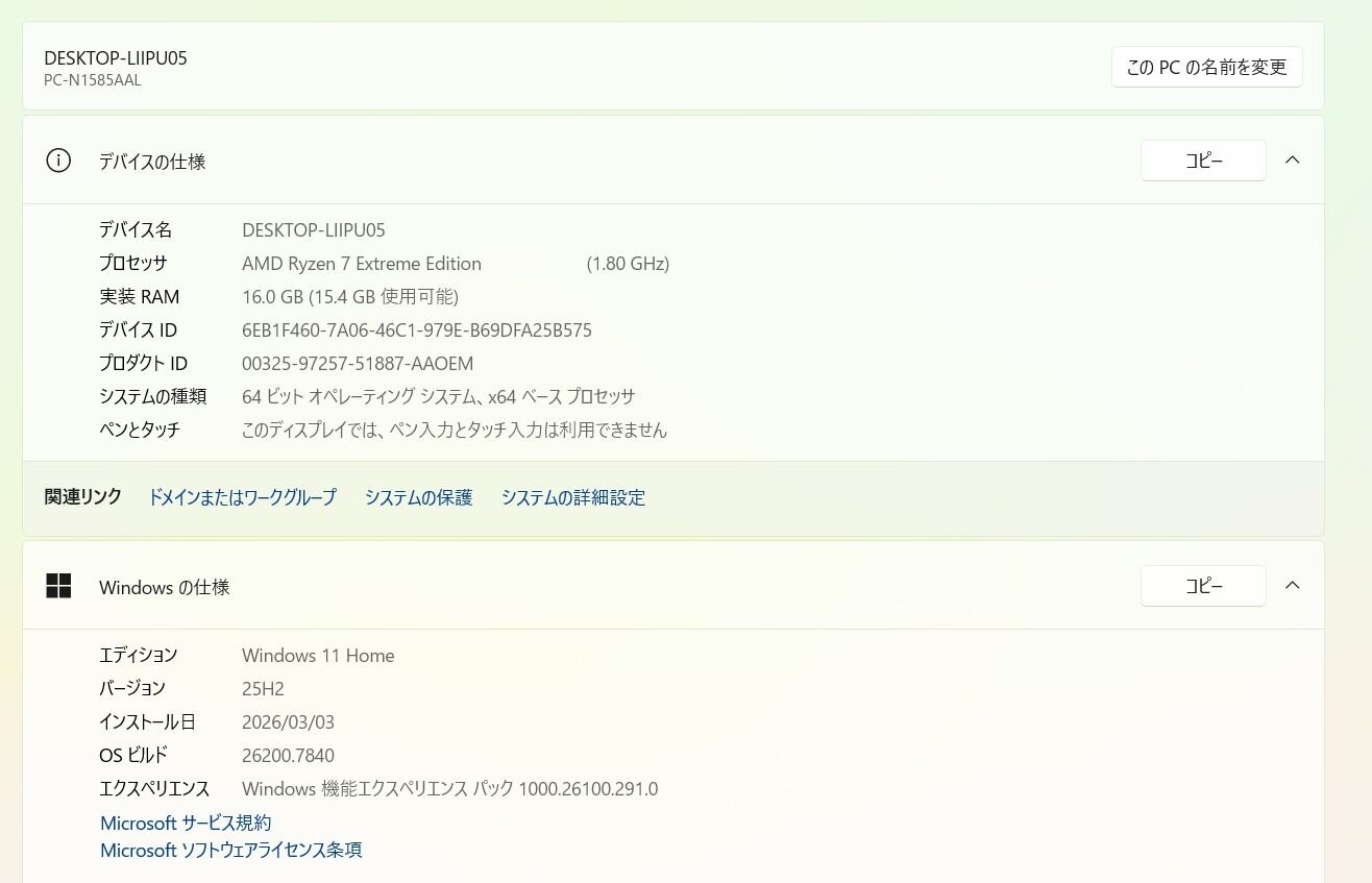 ・OS:Windows11 Home/25H2(ライセンス認証・Windows update済)