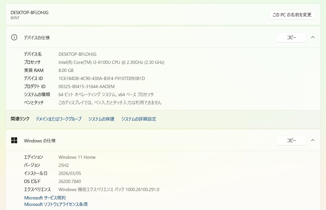・OS:Windows11 Home/25H2(ライセンス認証・Windows update済)
