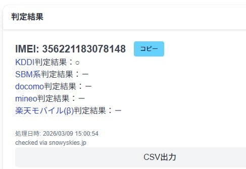 KDDI『○』判定、SIMロック解除有無不明です。