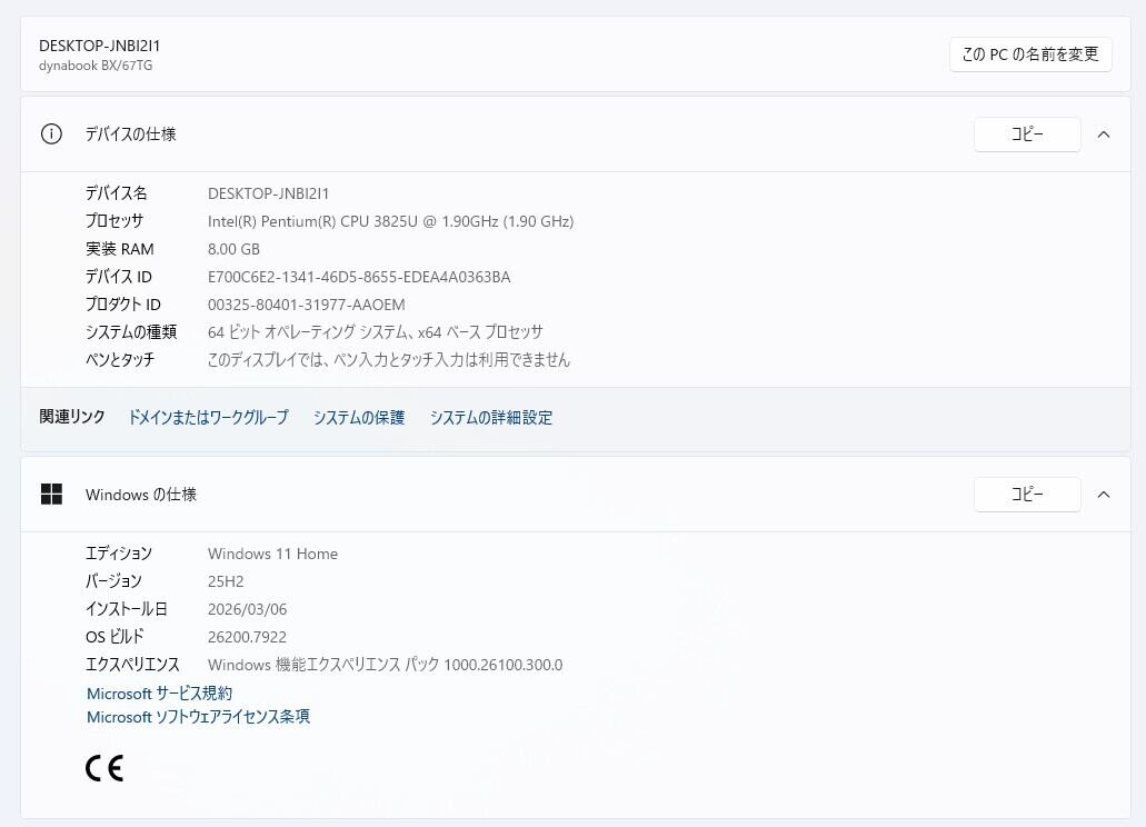 ・CPU:Intel Pentium 3825U 1.90GHz(1.90GHz)