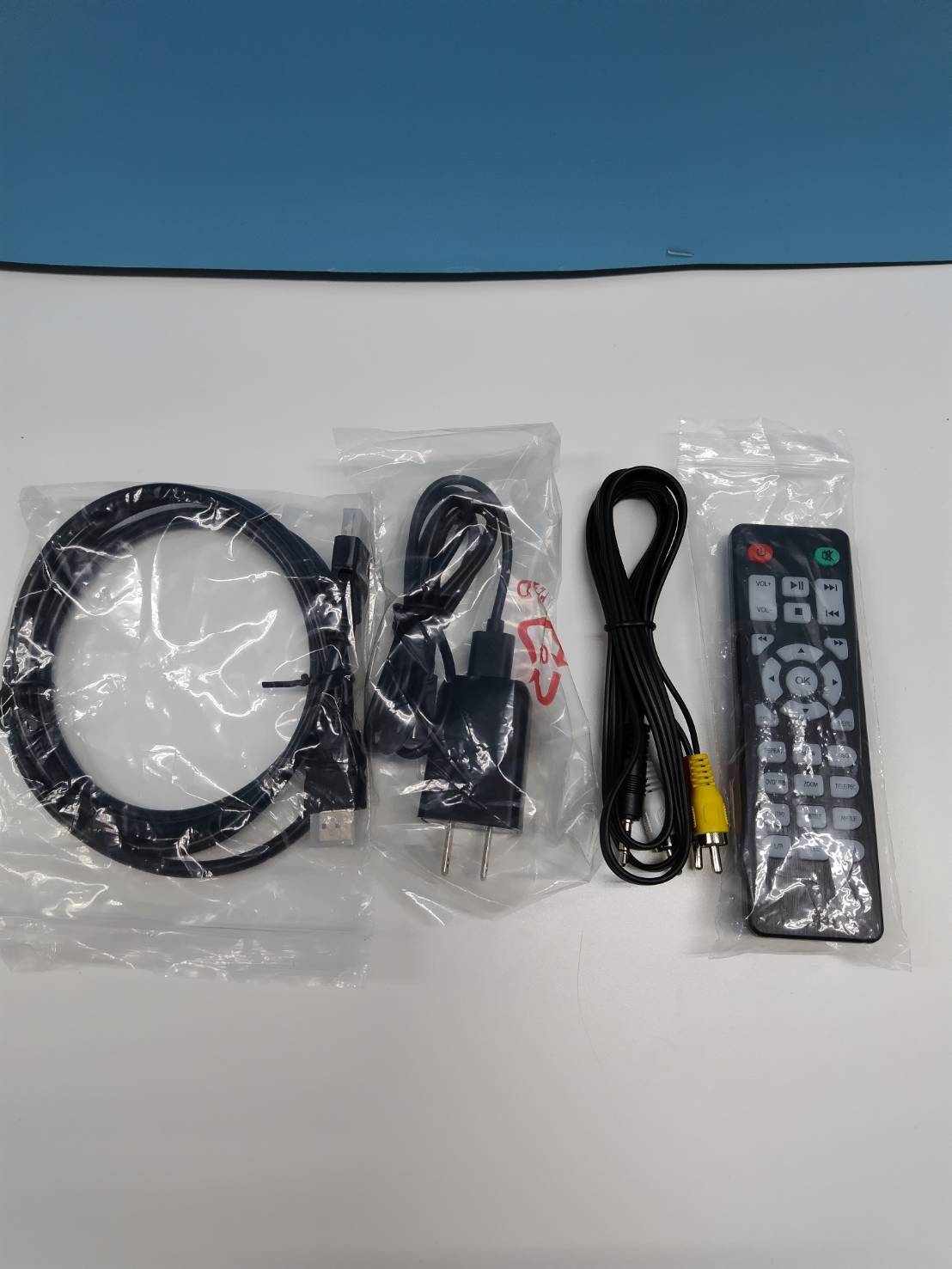 内容物:本体、リモコン、ACアダプター、HDMIケーブル、AVケーブル、印刷物(画像1枚目に写っているもの)