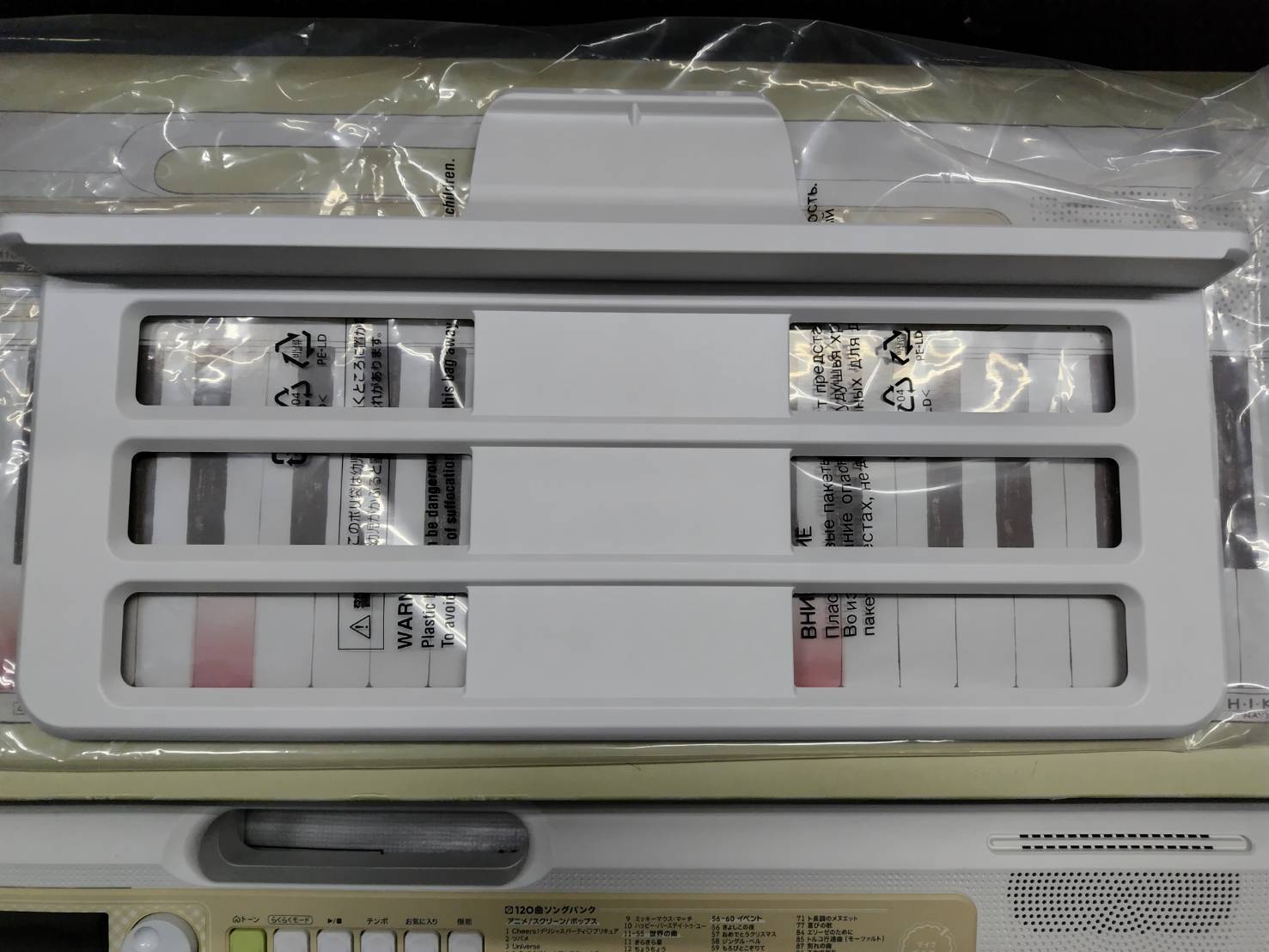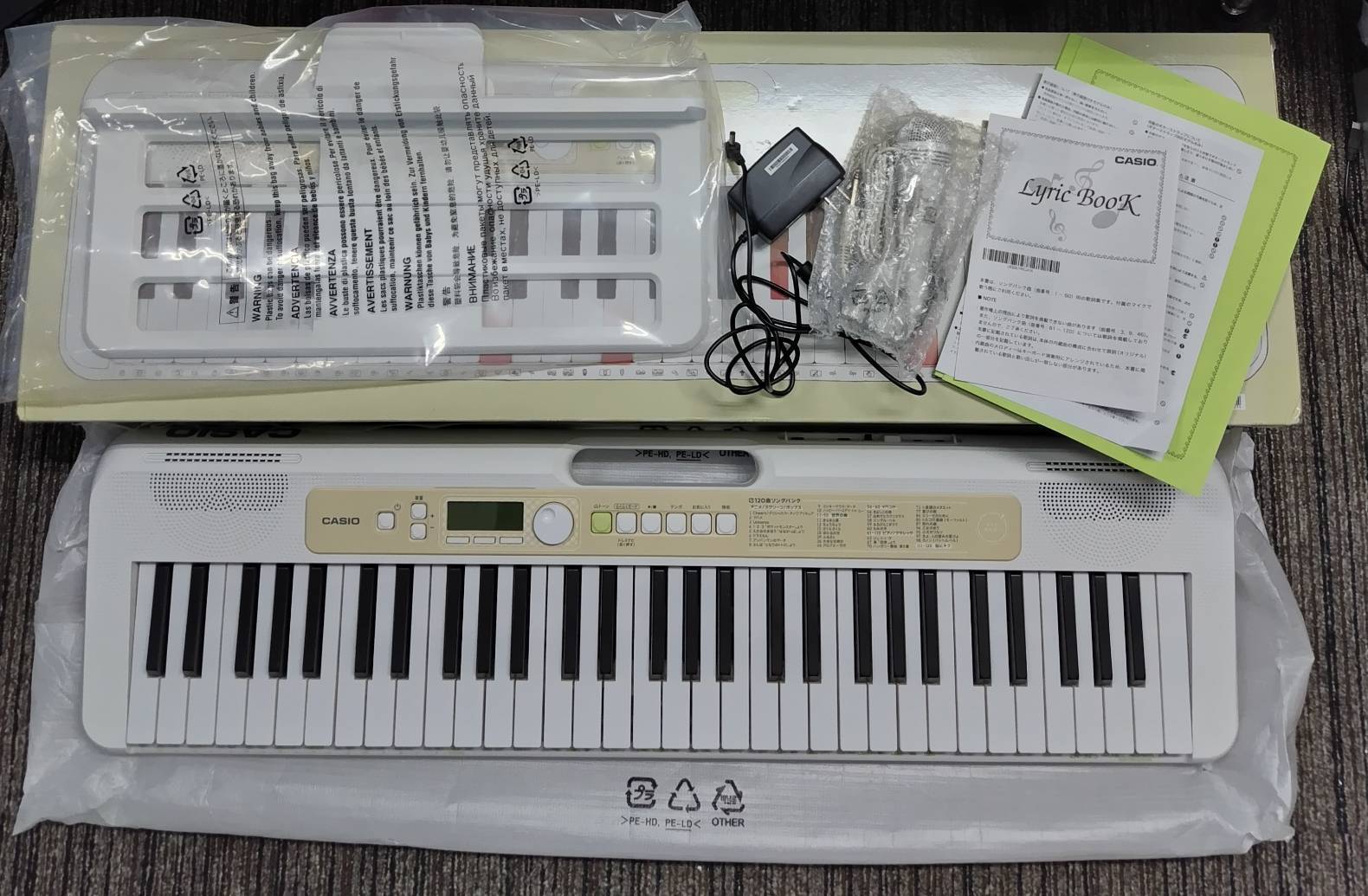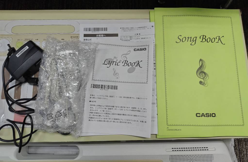 内容物:ピアノ、スタンド、ACアダプター、マイク(未開封品)、印刷物(画像1枚目に写っているもの)