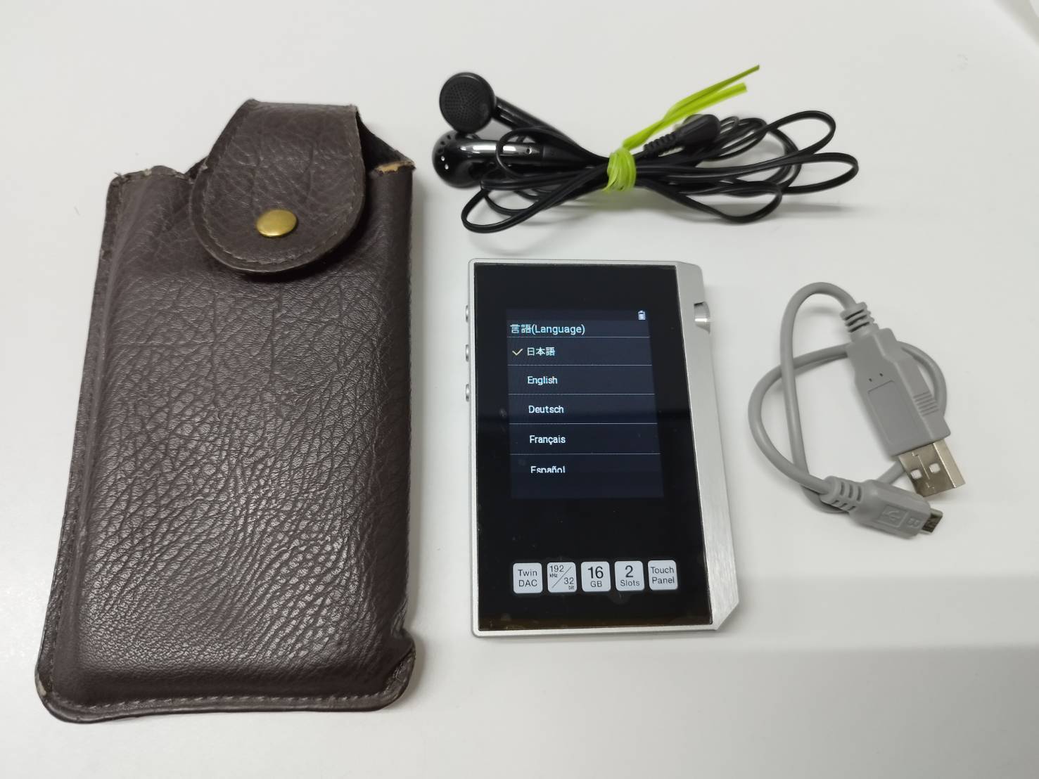 本体、カバーケース、有線イヤホン、microB to Type-Aケーブル(画像1枚目に写っているもの)