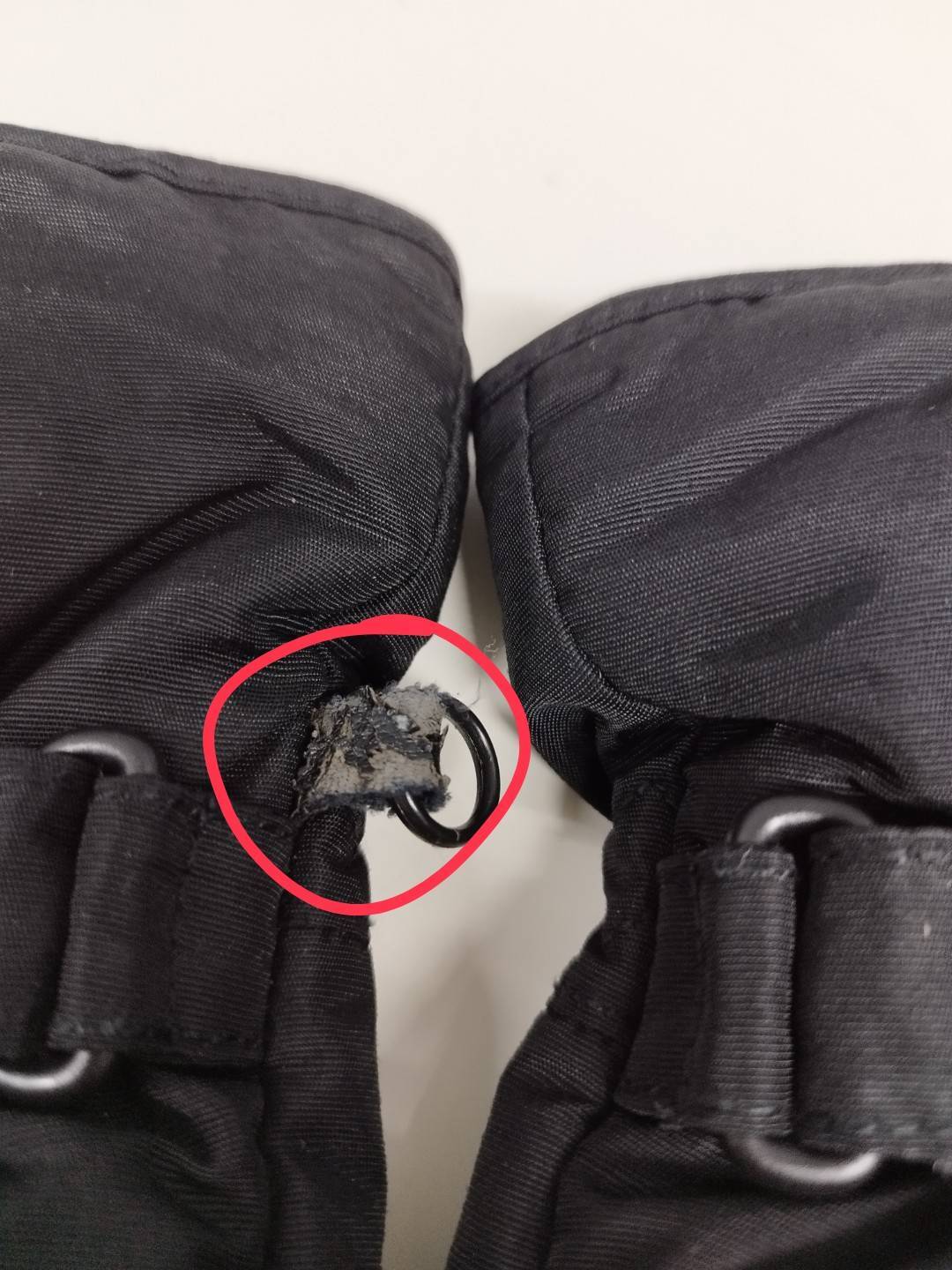 親指付近や手首付近のリングのある表面の生地がややはがれています。