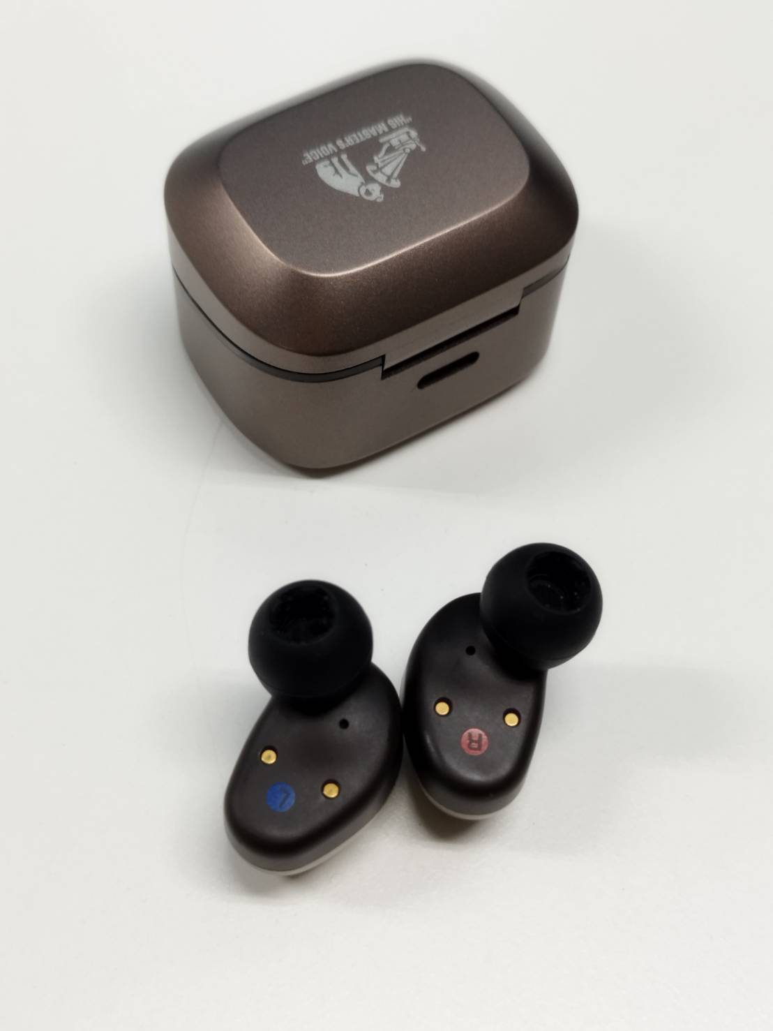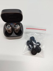イヤホン、充電ケース、イヤーピース、ステッカー(画像1枚目に写っているもの)