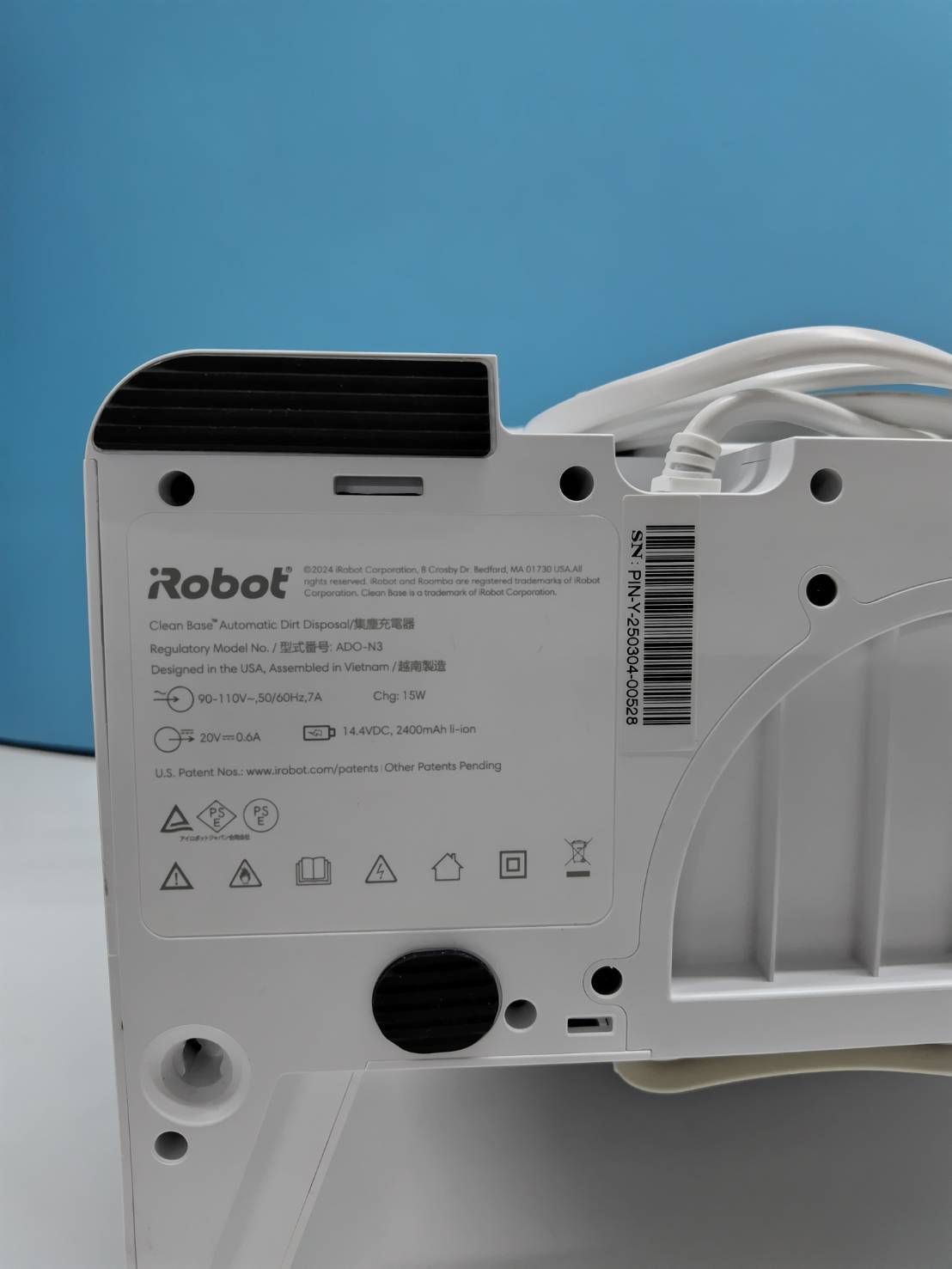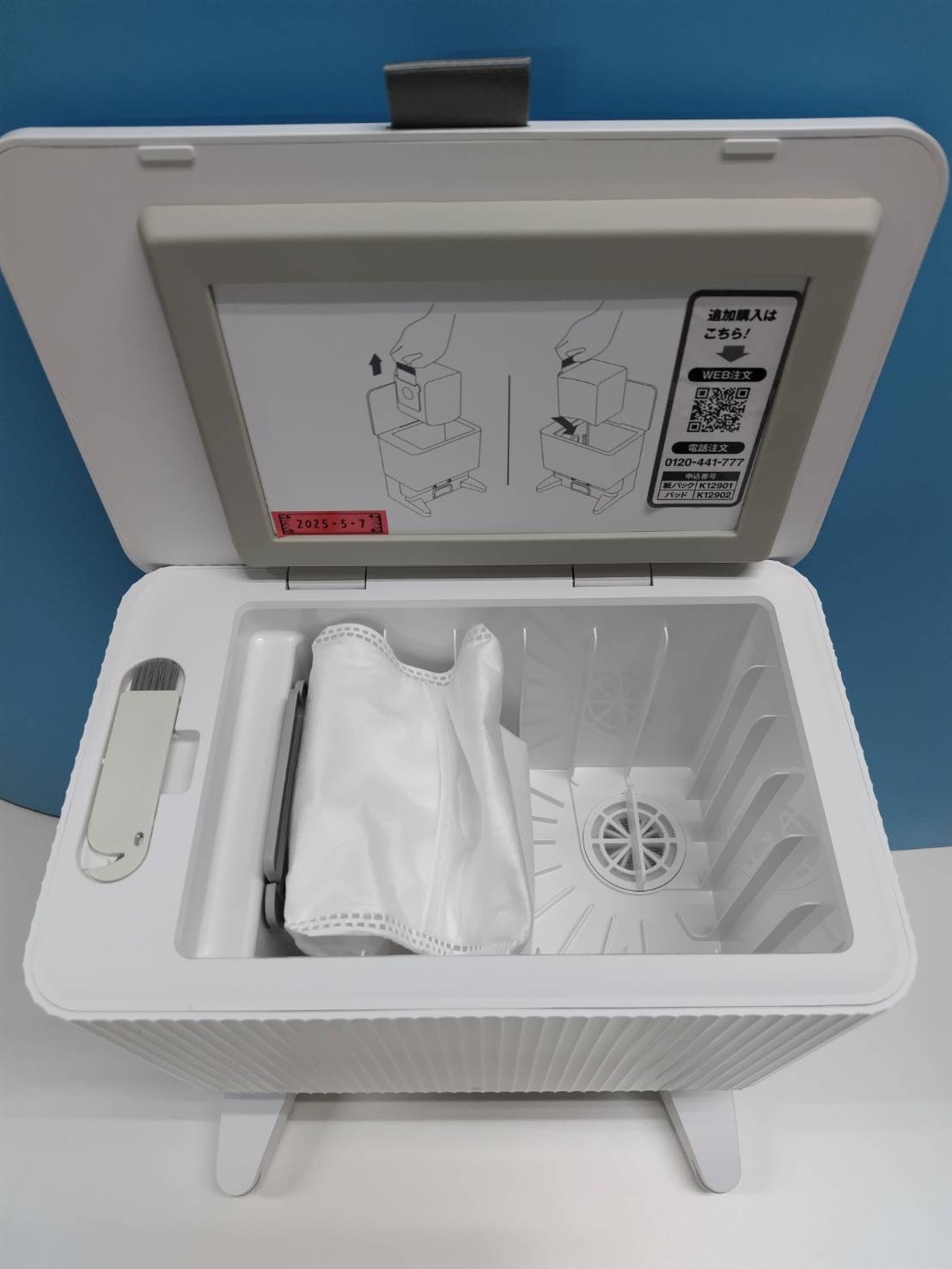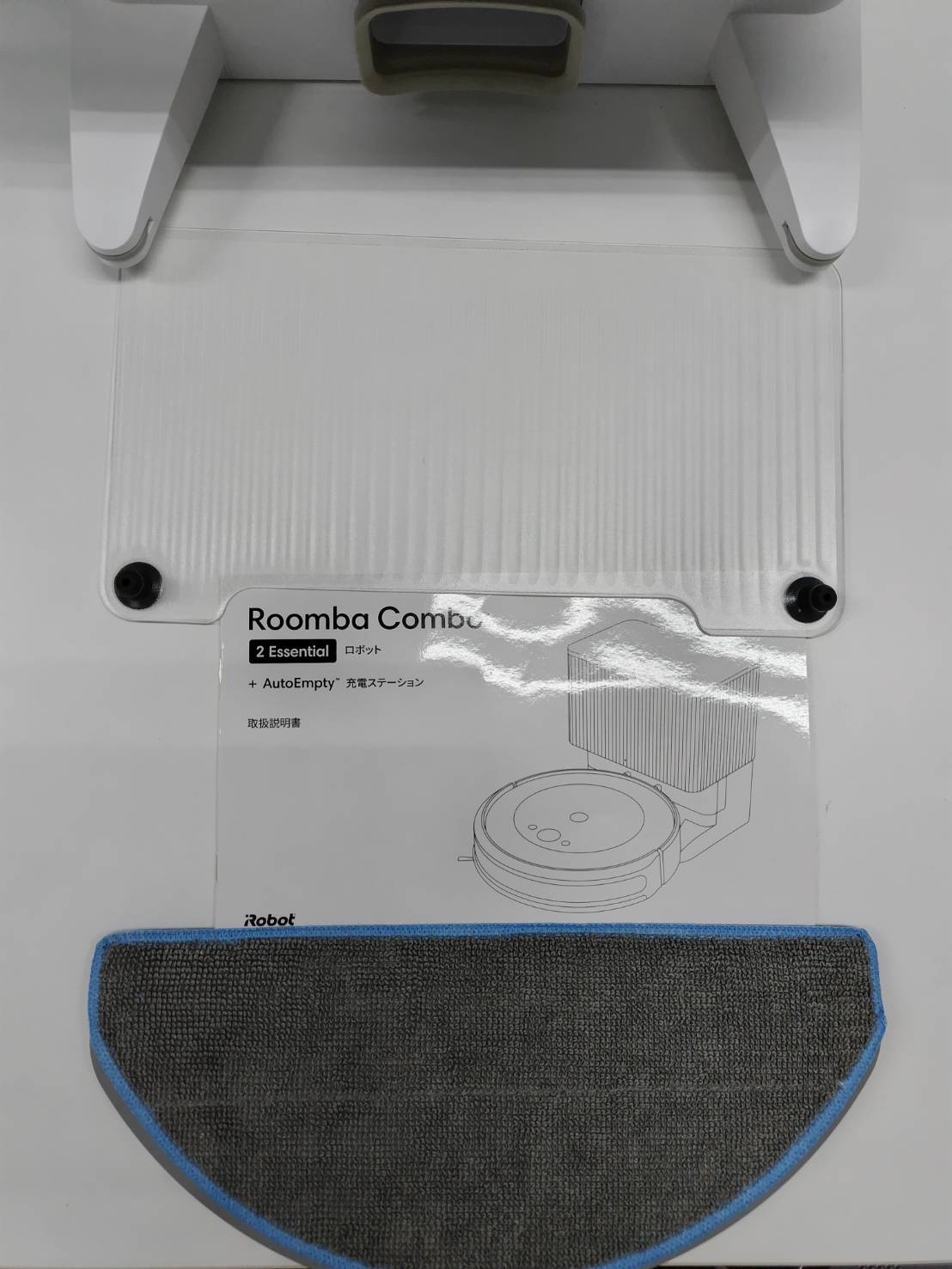 内容物:ルンバ、充電ベース、電源コード、ドリップトレイ、モップ、説明書(画像1枚目に写っているもの)