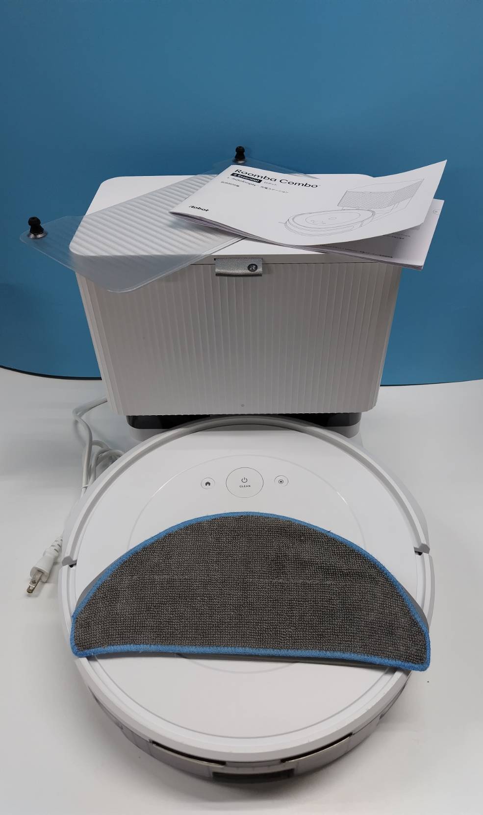 内容物:ルンバ、充電ベース、電源コード、ドリップトレイ、モップ、説明書(画像1枚目に写っているもの)