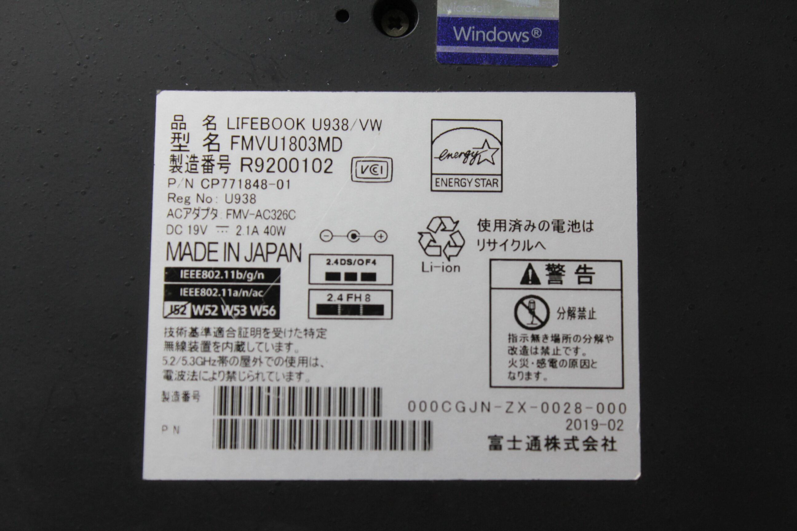 【中古ノートPC】富士通〈LIFEBOOK U938/VW〉Intel Core i7/SSD256GB/メモリ8GB ⑤